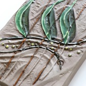 34㎝の大きな陶板に、3輪の大きなチューリップが衒いなく描かれた作品。オブジェ、陶板共に独特のデフォルメで存在感を見せるエステル・ヴァーリンらしい表情豊かな陶板です。
