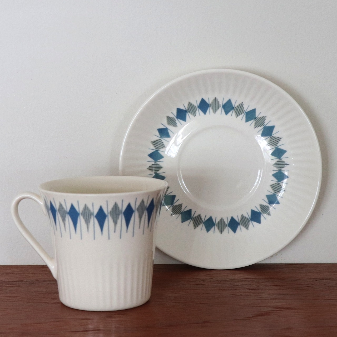 規則的なダイヤ模様と縦のシェイプがすらっとした品の有る表情です。素地は白ですが形状の影響で立体感と陰影があり、ミッドセンチュリーらしいなデザインに仕上がっています。
