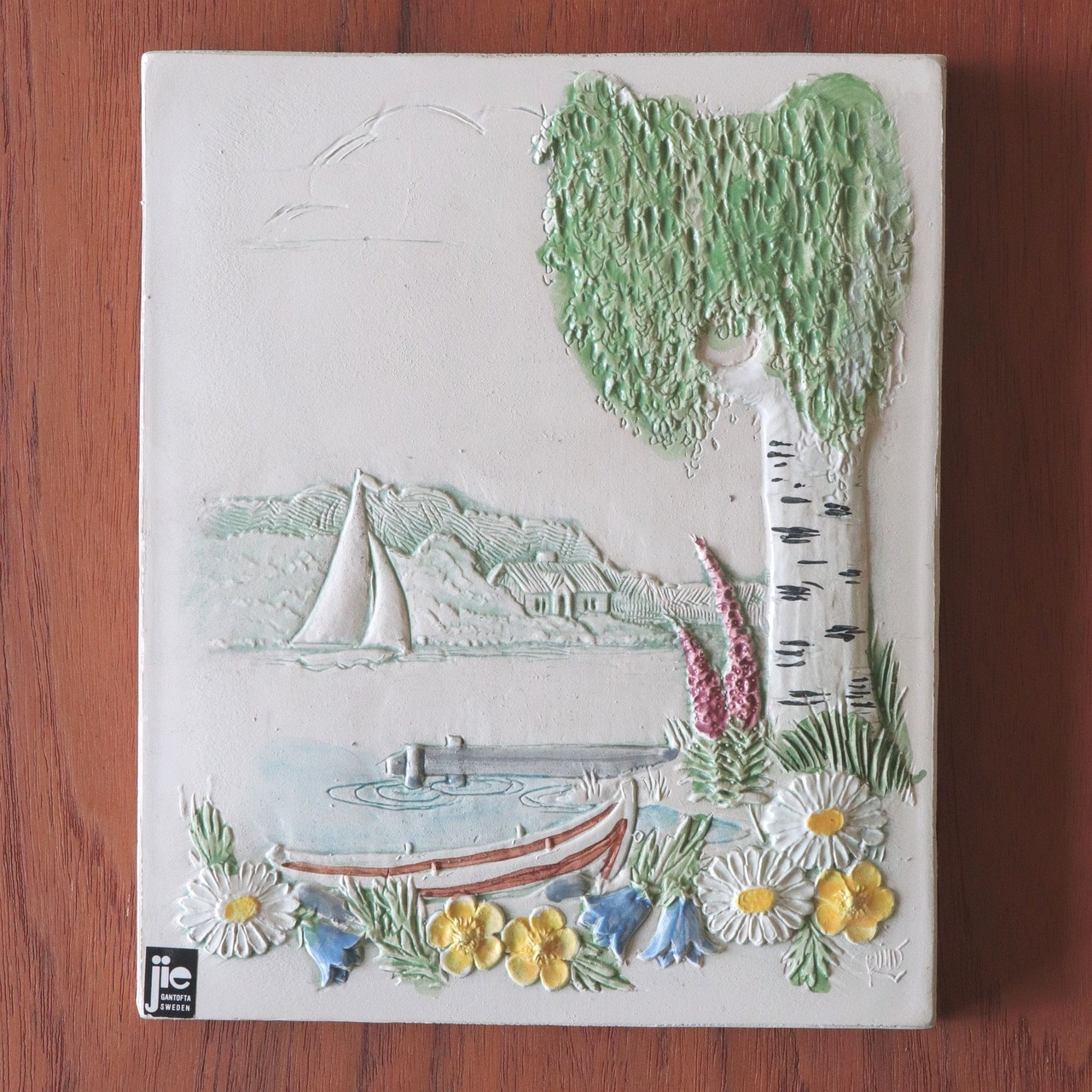 スウェーデンのJie Gantoftaで製作された陶板。スウェーデンの四季を描いた連作の一つで「夏」の風景を描いています。白をベースに、湖畔に船を浮かべた穏やかな風景です。