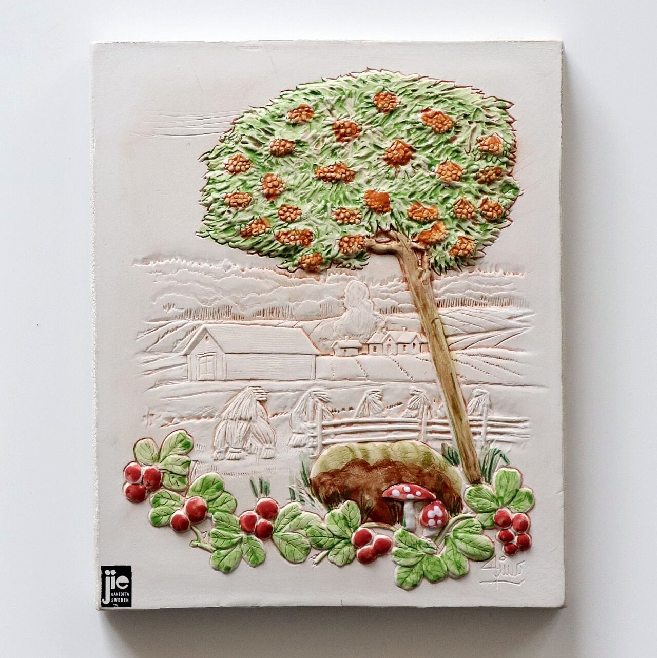 スウェーデンのJie Gantoftaで製作された陶板。スウェーデンの四季を描いた連作の一つで「秋」の風景を描いています。白をベースに、木に果物がたわわと実る牧歌的な風景です。