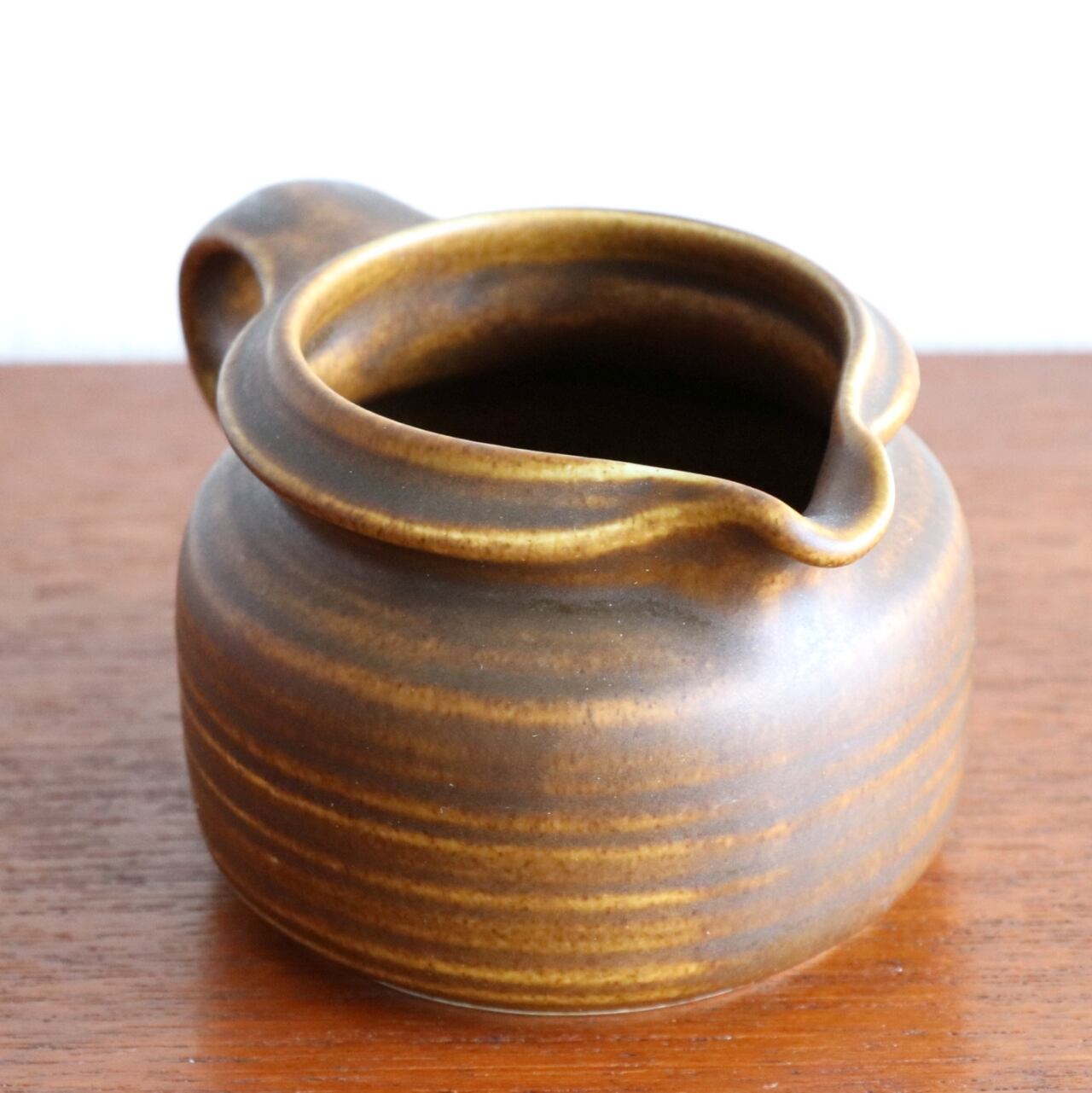 Kaana=樹皮、といった意味のフィンランド語で名前のようにマットで色のグラデーションがあるブラウンの釉薬で製作されたシリーズです。クリーマーとして製作されたようですが背は少し控えめで、料理用のソースやドレッシングのミキシングに、また小さなフラワーベースにといった使い方も考えて製作されたように思われるサイズです。