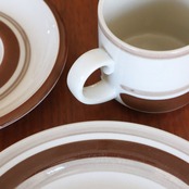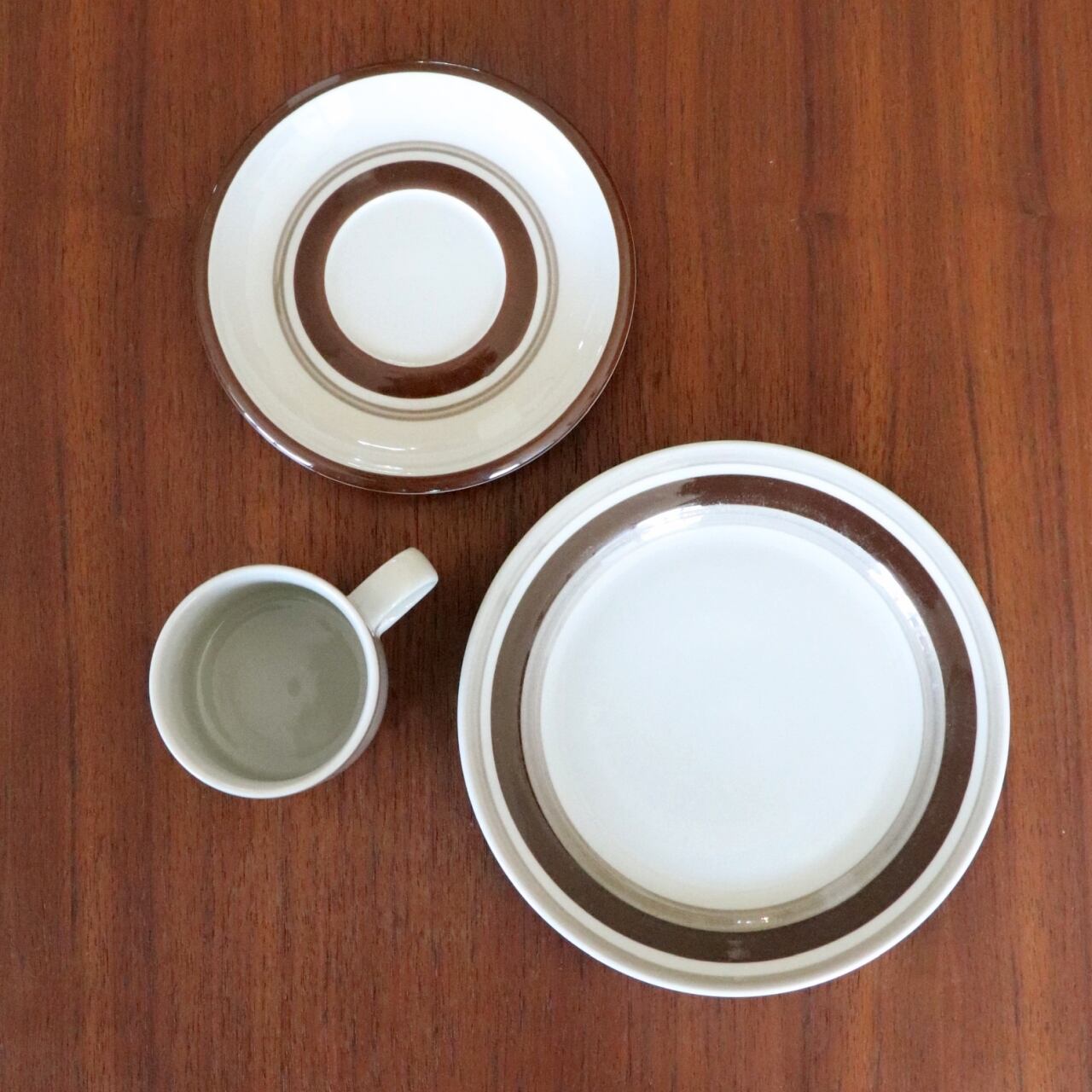 1969-1985年の間、フィンランドのアラビアで製作されたピルッティ(Pirtti)。Anja Jaatinen-Winquistがフォルムデザインを、Raija Uosikkinenが装飾を手がけたシリーズです。 同系色の濃淡で描かれたライン、とシンプルな構成はライヤ・ウォッシキネンの他の作品でも見られますが、飽きがこず長くご愛用頂けそうなデザインです。