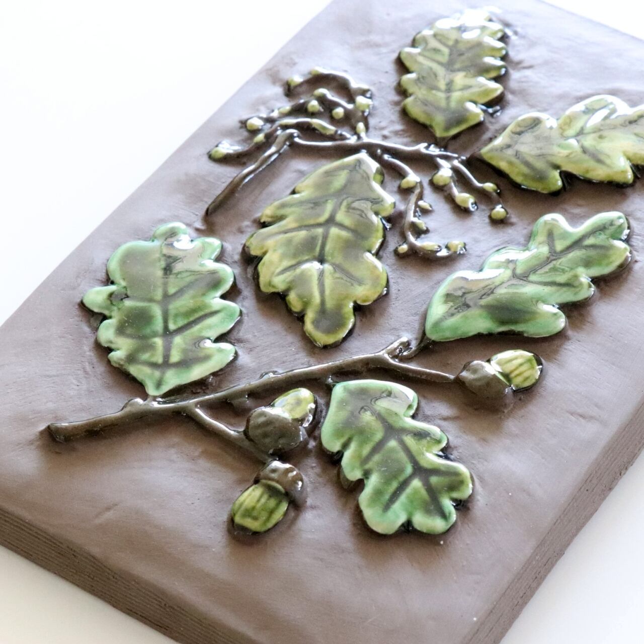 青々としたドングリを描いた作品。背面は壁掛けが出来るように針金が付いています。