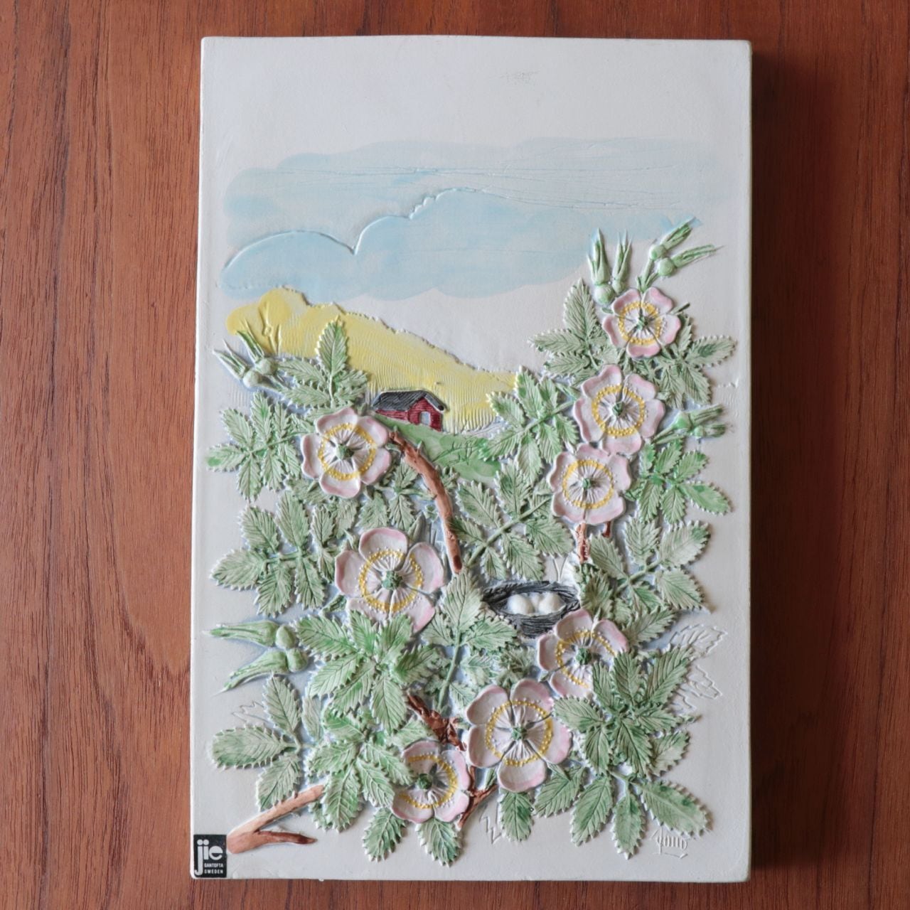 スウェーデンのJie Gantoftaで製作された陶板。1960年代からスウェーデンの家庭で人気となった陶板のひとつです。背面は壁掛けが出来るように針金が付いています。