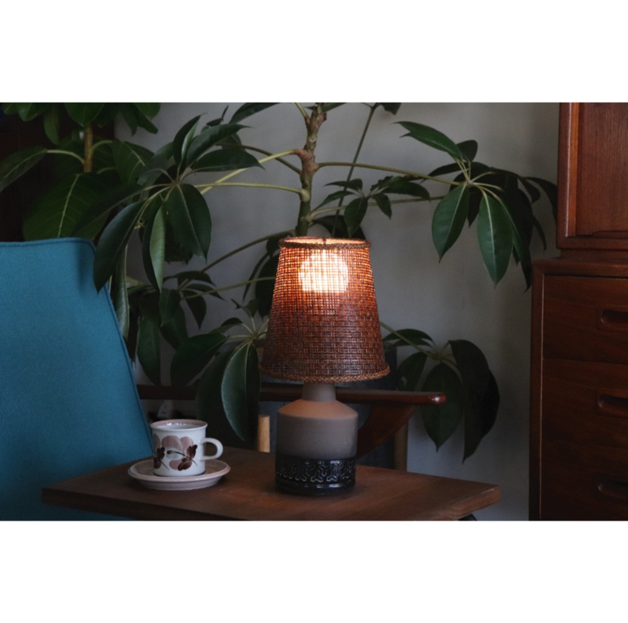無釉の濃いブラウンをベースに同じく茶色の釉薬で模様を描いたミッドセンチュリーらしいランプです。