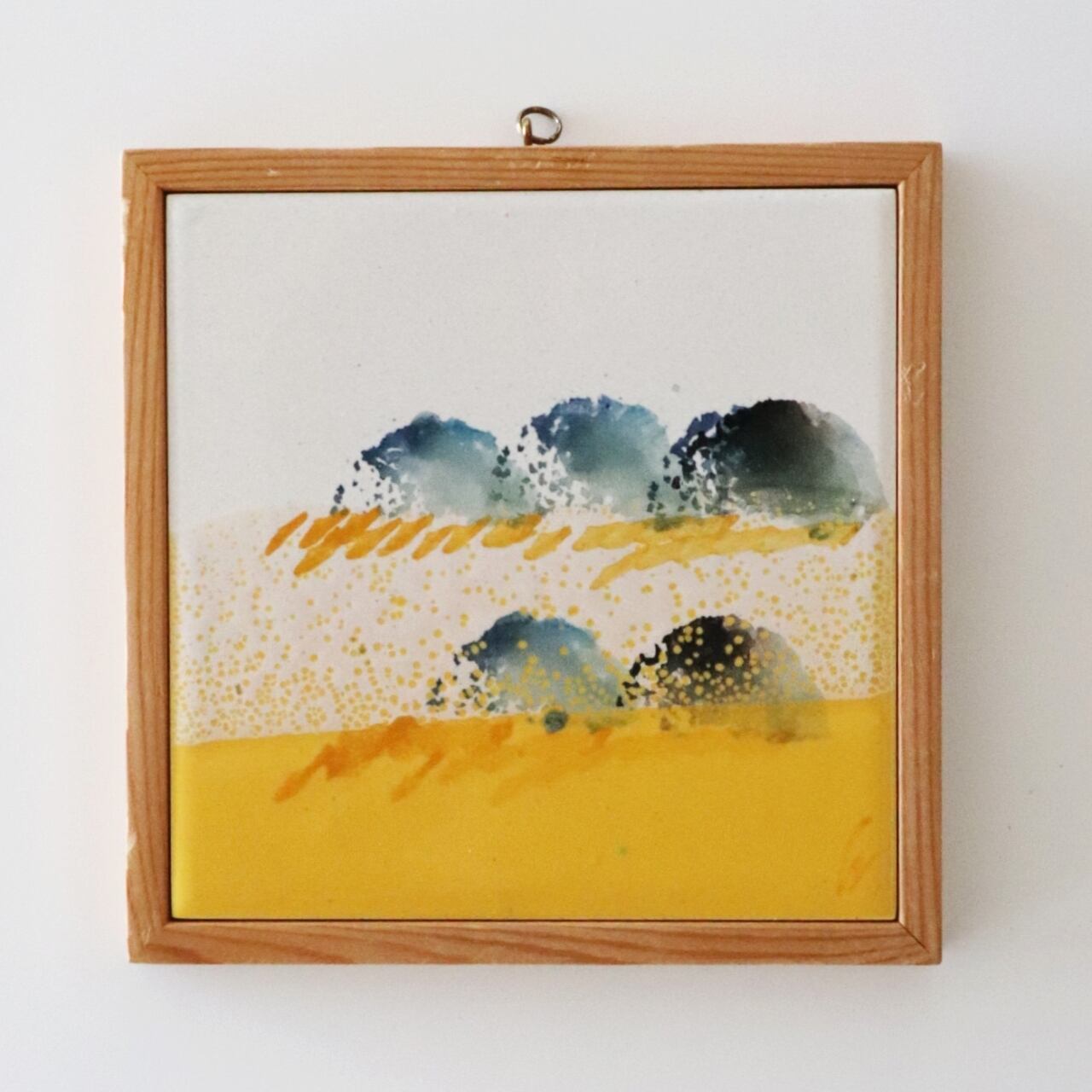 木製の枠に入った陶板。絵はハンドペイントで描かれています。鍋敷きや壁飾り用として製作されたものの一つです。牧歌的で優しいタッチの絵はデンマークはもちろん周辺国でも人気だったようで、シリーズとしていろいろな絵柄が製作されています。