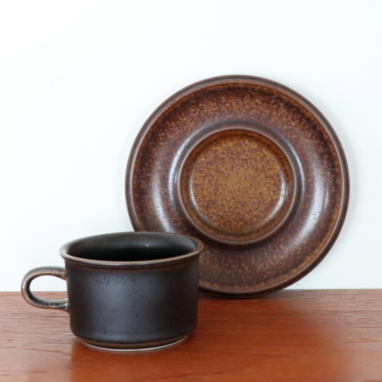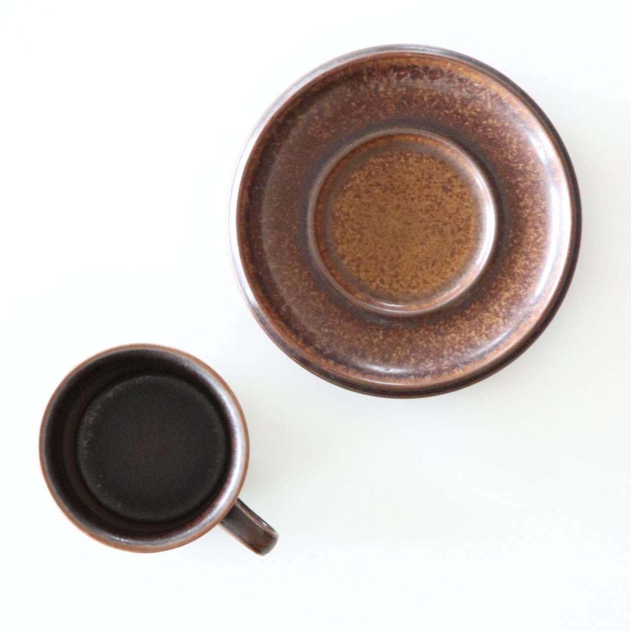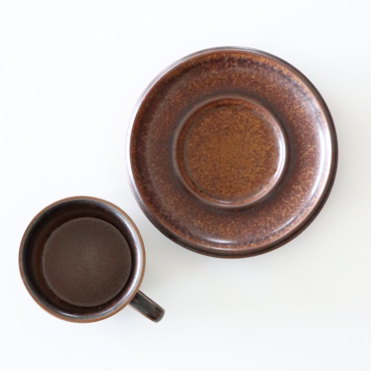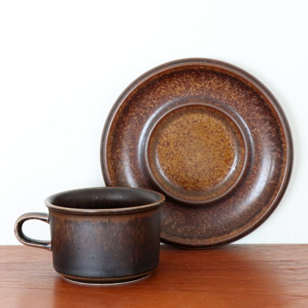 1960-1999年の間、アラビアでロングセラーとなったRuska。フォルム、デコレーションともにウラ・プロコペによるデザインとなります。 ベース地となる茶色の釉薬に鉄の粉を混ぜ込む事で一つ一つに個性を出す仕上げとなります。そのため揺らぎのある表情で、自分用にと同じシリーズでも違いが見出せることも人気のひとつです。