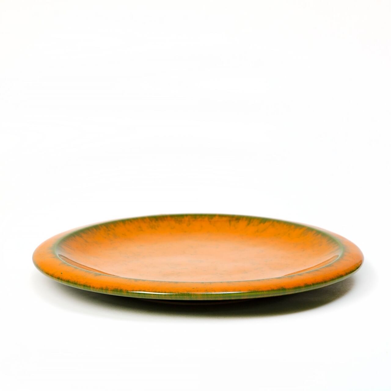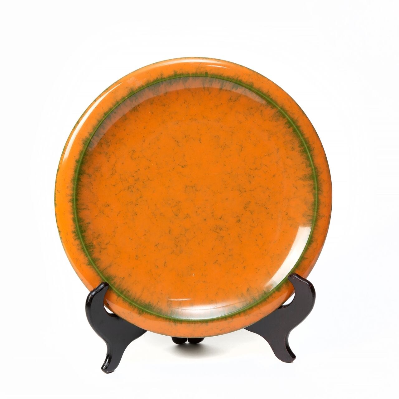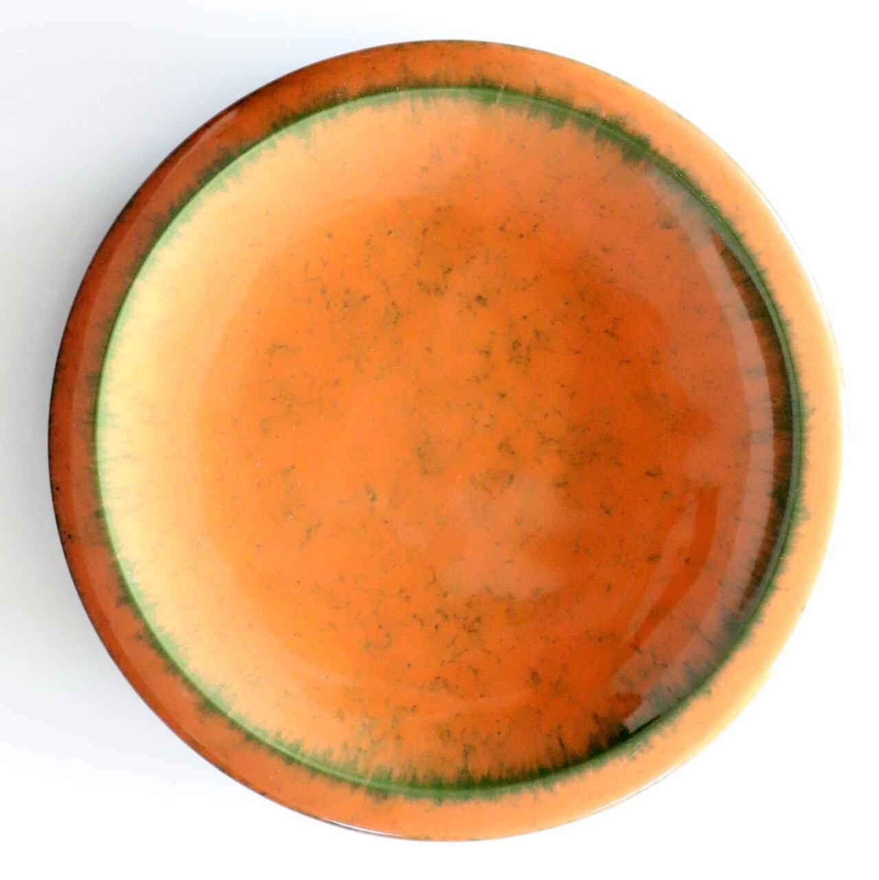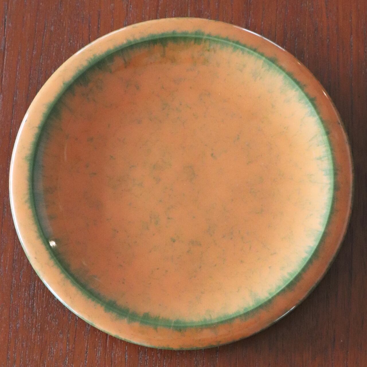 同シリーズは大量生産を目的としないアートピースの作品群で、それぞれ限定的に製作されたためきわめて希少な品となっています。1996年に製作されたこちらは26㎝ほどある大きなプレート。抹茶色の素地に橙の色を重ねた厚手の釉薬が使用されています。