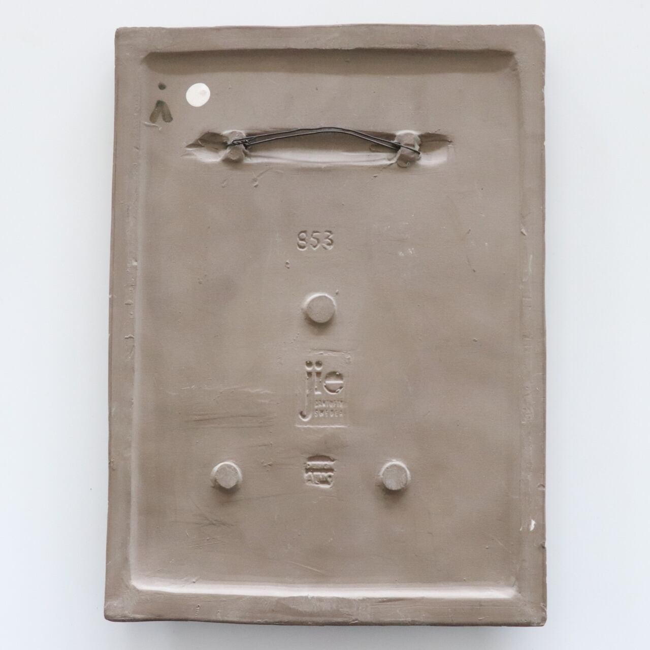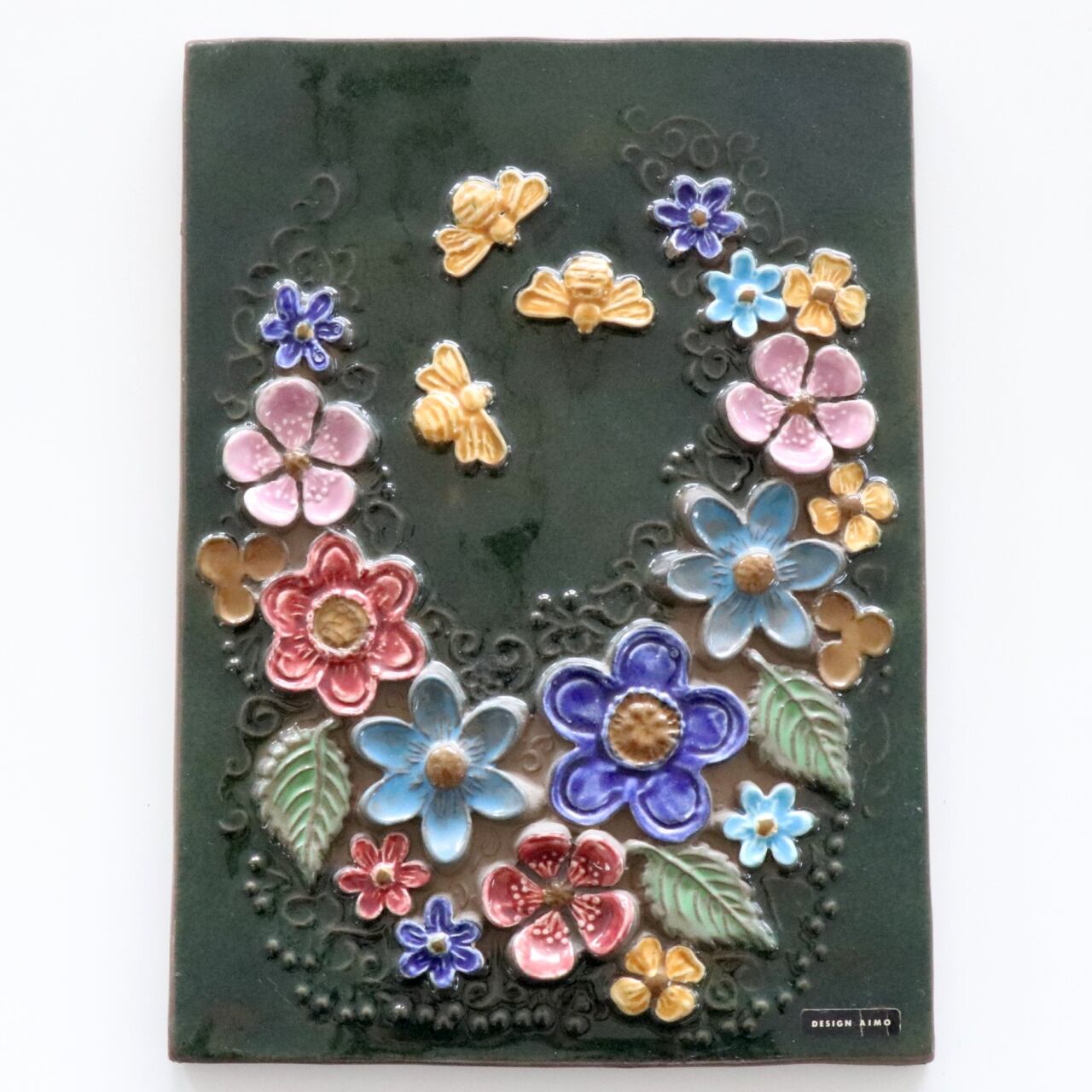 32㎝と比較的大きなサイズで製作されておる大型の陶板です。Aimoらしい愛らしい花畑にデフォルメされた蜂が飛び交う牧歌的で優しい表情の作品です。背部は壁掛けが出来るように穴が開けられて製作されています。