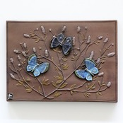 木に咲く花に集う蝶が3匹が描かれています。素地は無釉のブラウンで、落ち着いた静かな空間をイメージさせられる作品です。