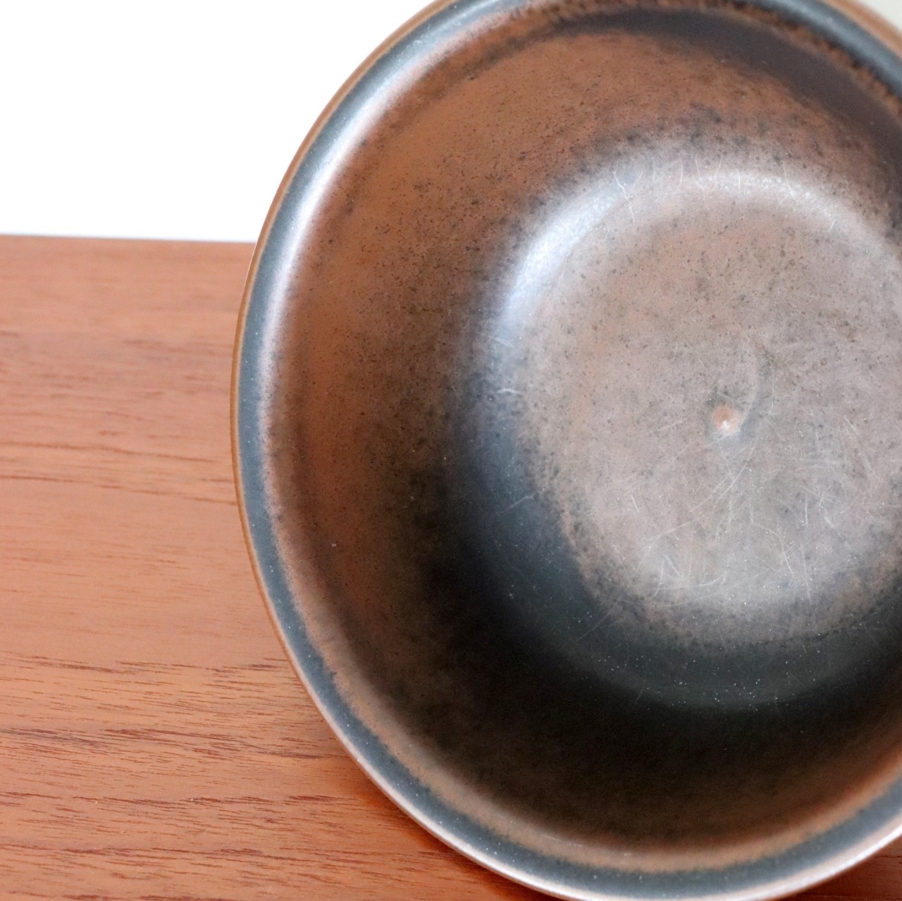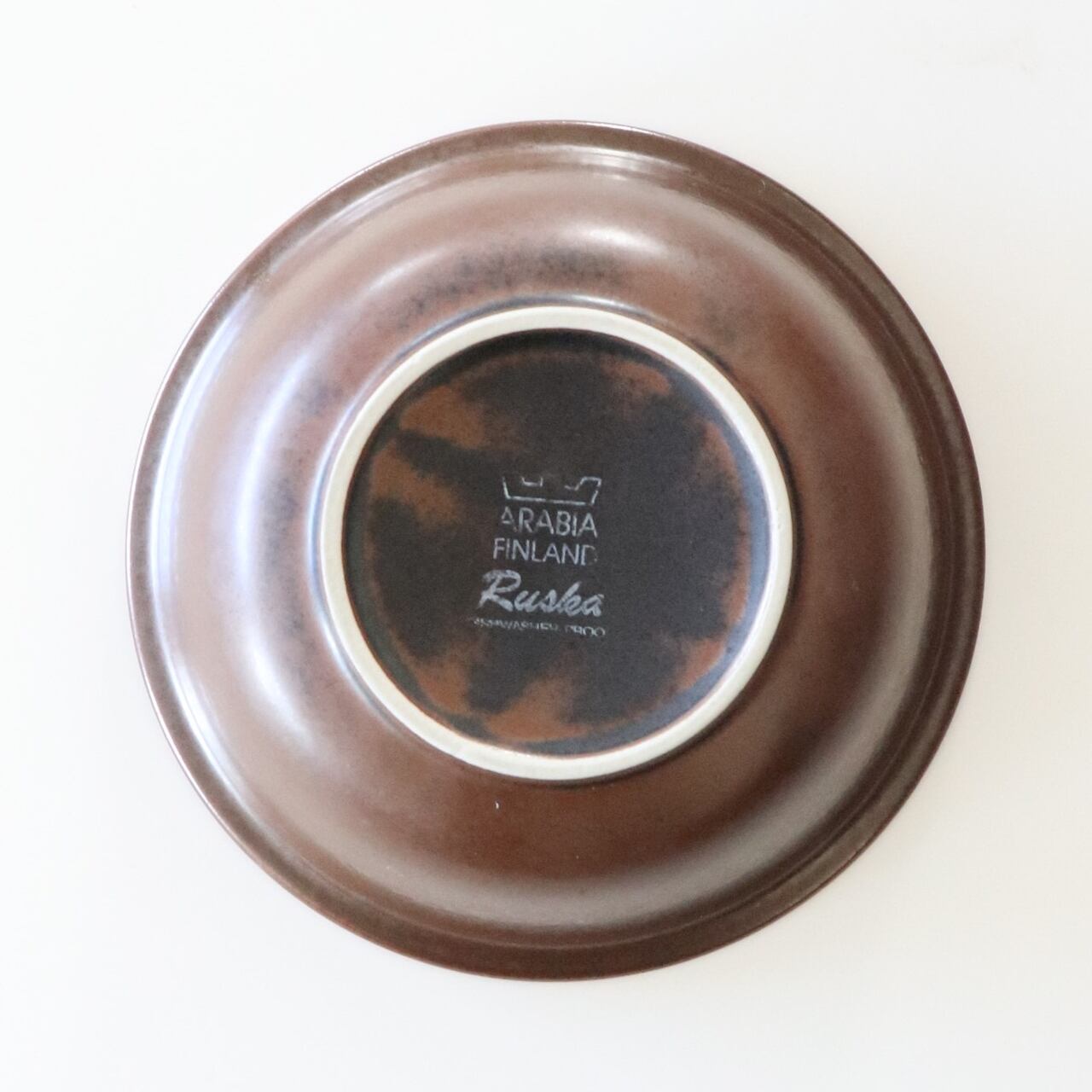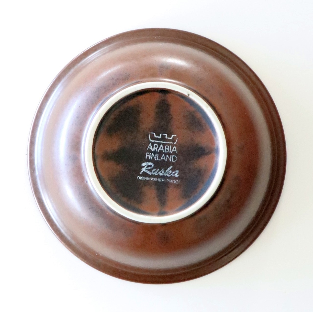 1960-1999年の間、アラビアでロングセラーとなったRuska。フォルム、デコレーションともにウラ・プロコペによるデザインとなります。 ベース地となる茶色の釉薬に鉄の粉を混ぜ込む事で一つ一つに個性を出す仕上げとなります。そのため揺らぎのある表情で、自分用にと同じシリーズでも違いが見出せることも人気のひとつです。