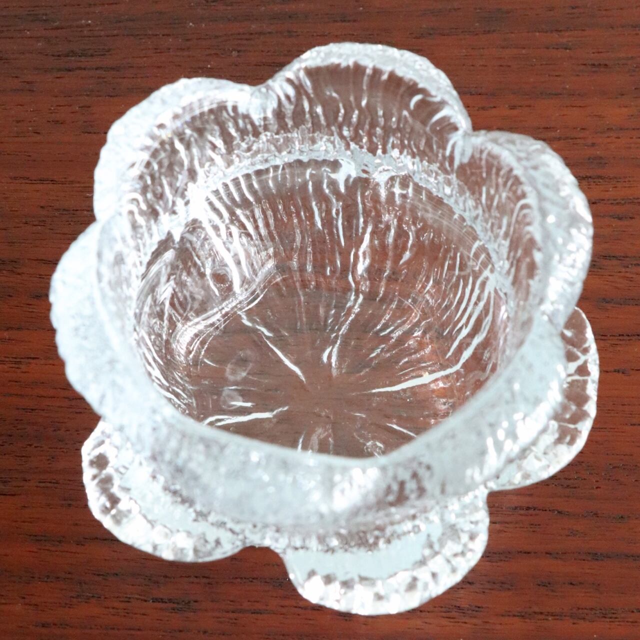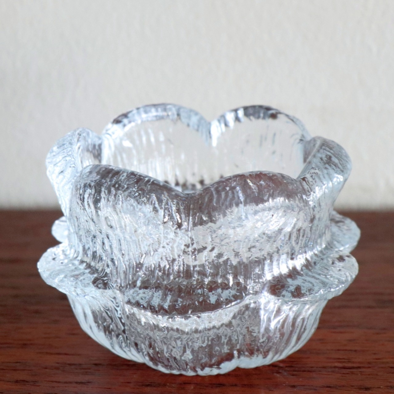 1970年代に製作されたものと思われます。6枚の花弁が花開いたデザインとなっており、蝋燭の灯りが華やかな表情となる、小さくて美しい作品です。