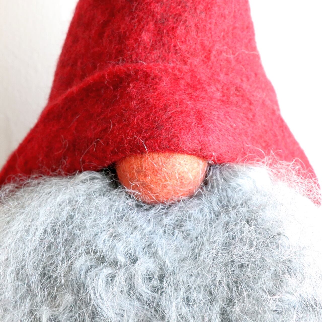 羊(ゴットランドシープ)の毛を筆頭に、アイスランド、オーストラリア、ノルウェーの羊の毛が使用されています。毛刈りから加工まですべてが手作業です。帽子と鼻に使用しているフェルトは、羊毛をこしらえることから始まり、すべて自分たちの手で製作しています。一体一体に違った個性があり、高級感と存在感のあるトムテ人形です。