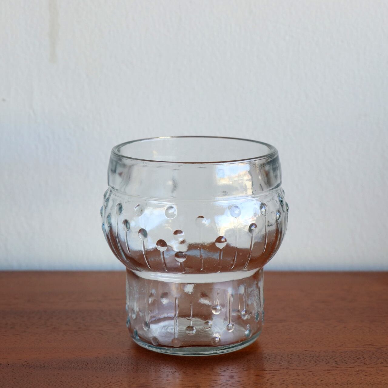 グラスはプレスガラスの手法で凹凸のある表現をしたシリーズで、ベースやタンブラー、グラスといった様々なフォルムを製作しています。飲み物を入れるとその揺らめきも楽しめるようにデザインされています。