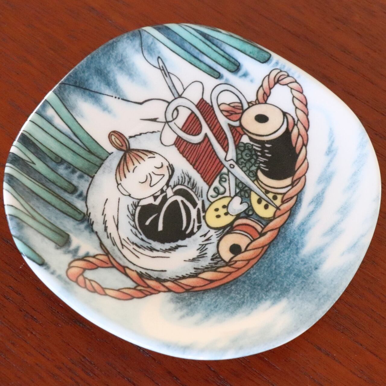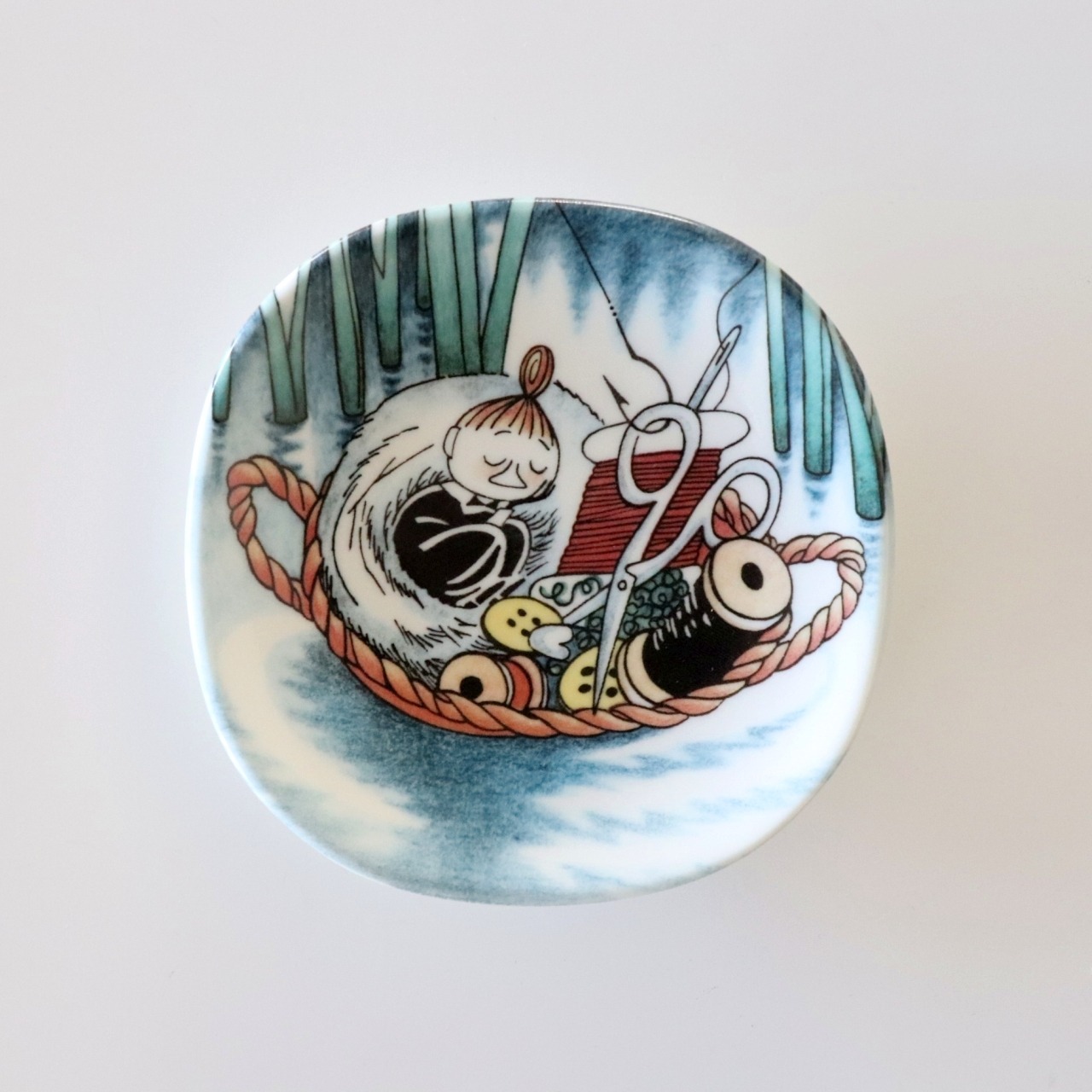 こちらは第三弾となる1999-2002年の間にフィンランドのアラビアで製作されたウォールプレートで「Nap in Sewing basket(針箱で居眠り)」と名付けられた一枚です。お針箱の中で眠るミィは愛らしく、飾っているだけで何だか優しい気持ちになりそうなアイテムです。