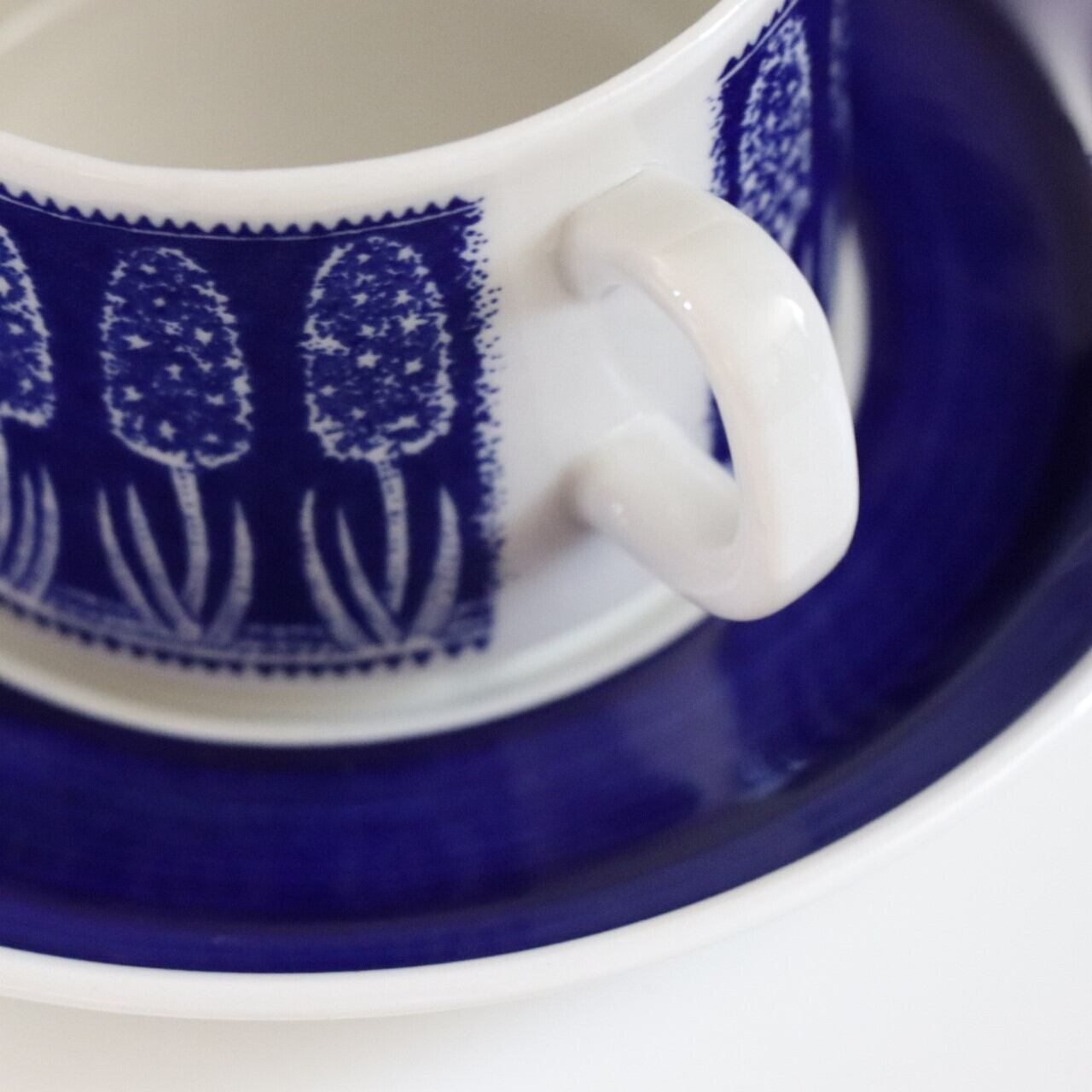 初期の1956-69年には一回り大きなサイズ(AUモデル)で製作され、後期の1973-79年に形状を変えて再度製作されたもののうちの1点です。深い青に白抜きのヒヤシンス。点描のような上品な柄は当時から世評が高く、現在のスウェーデンでも人気の高いシリーズです。