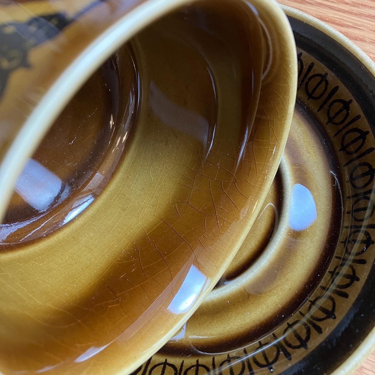 ハンドペイントで絵柄を描いた後に透明の釉薬をかけて再度焼成されています。その収縮率の差で内側に貫入が入ることも多く、こちらのセットもカップ内部を含め貫入が目立ちます。貫入は外部に広がるようなものでは無く、水を入れても染みるようなものでは無く、あくまで性質の一部のように思われます。