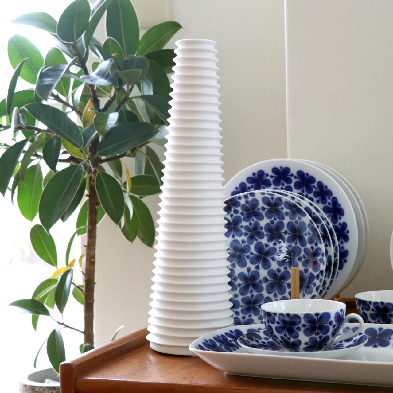 消灯時には乳白色のオブジェ的な陶器の表情ですが、点灯すると電球の光に合わせて光が透過され穏やかな表情を見せるランプです。