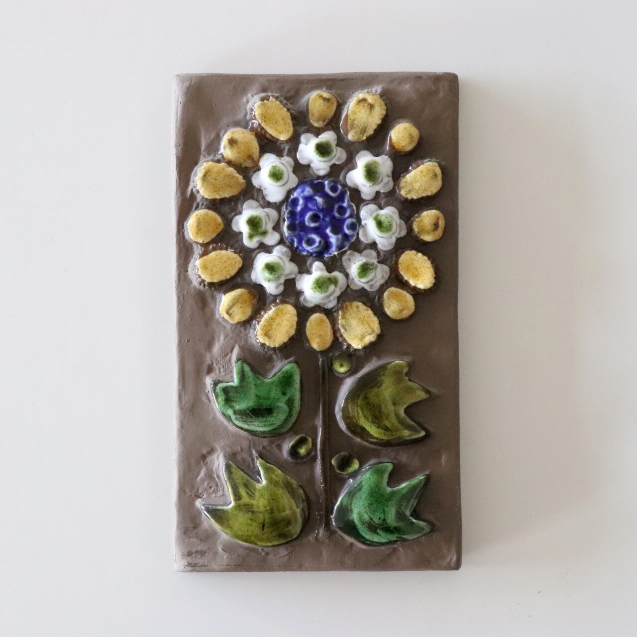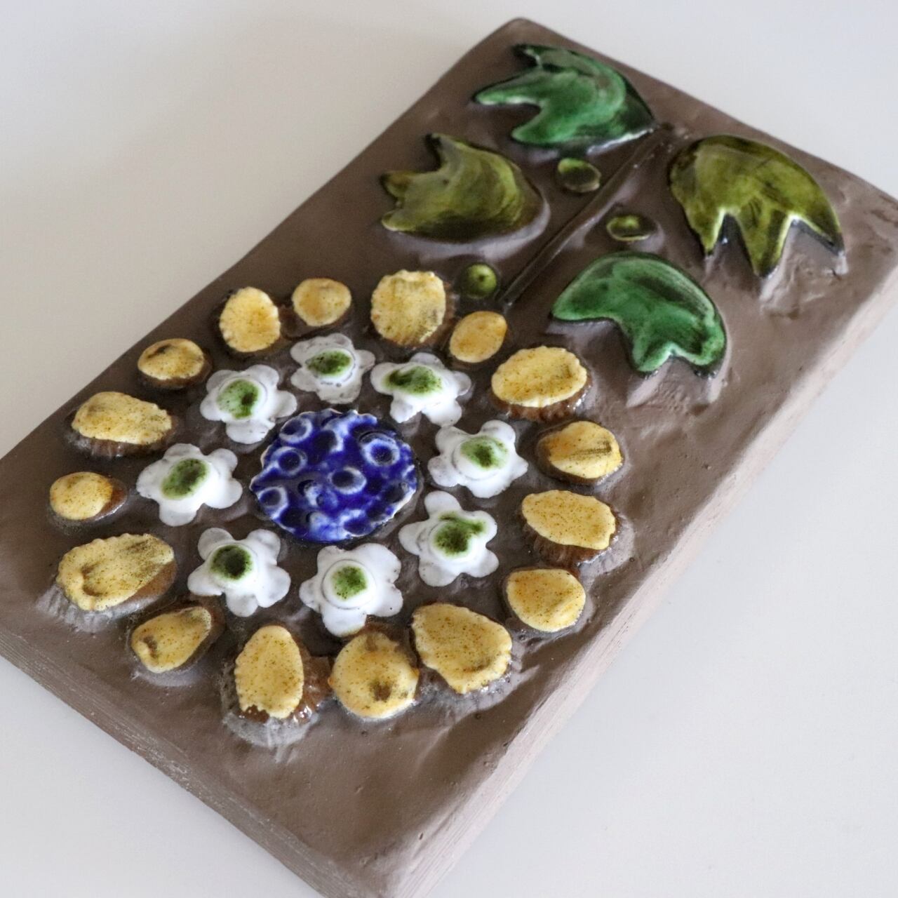 スウェーデンの陶器会社ジィガントフタ(jie gantofta)製の陶板。意匠化された花が華やかに咲き誇る陶板。 壁掛けが出来るよう背面に紐が通せる穴が開いています。