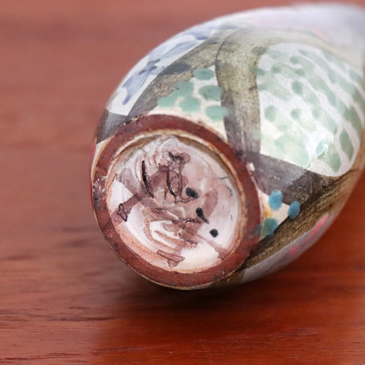 造形は精巧で、手描きで描かれた模様は大らかながらも繊細な表情。小さな一輪挿しながらも独特の存在感を放つ作品です。
