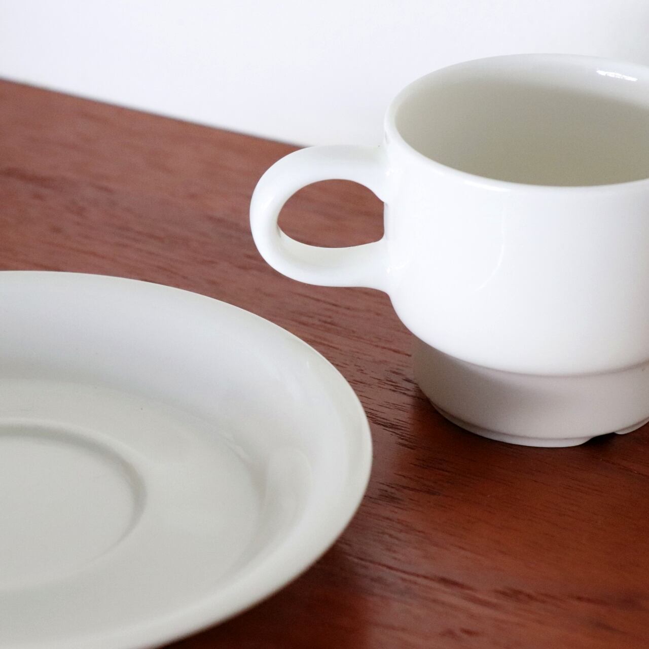 公共施設やレストランなど業務用のデザインを得意としたGoran Backらしい機能的なデザインで、カップは重ね置きがしやすいようなフォルムで形成さされています。同シリーズは大きく2つのカップデザイン、3つの色(ホワイト、一部にブラウン、一部にモスグリーン)で製作されています。