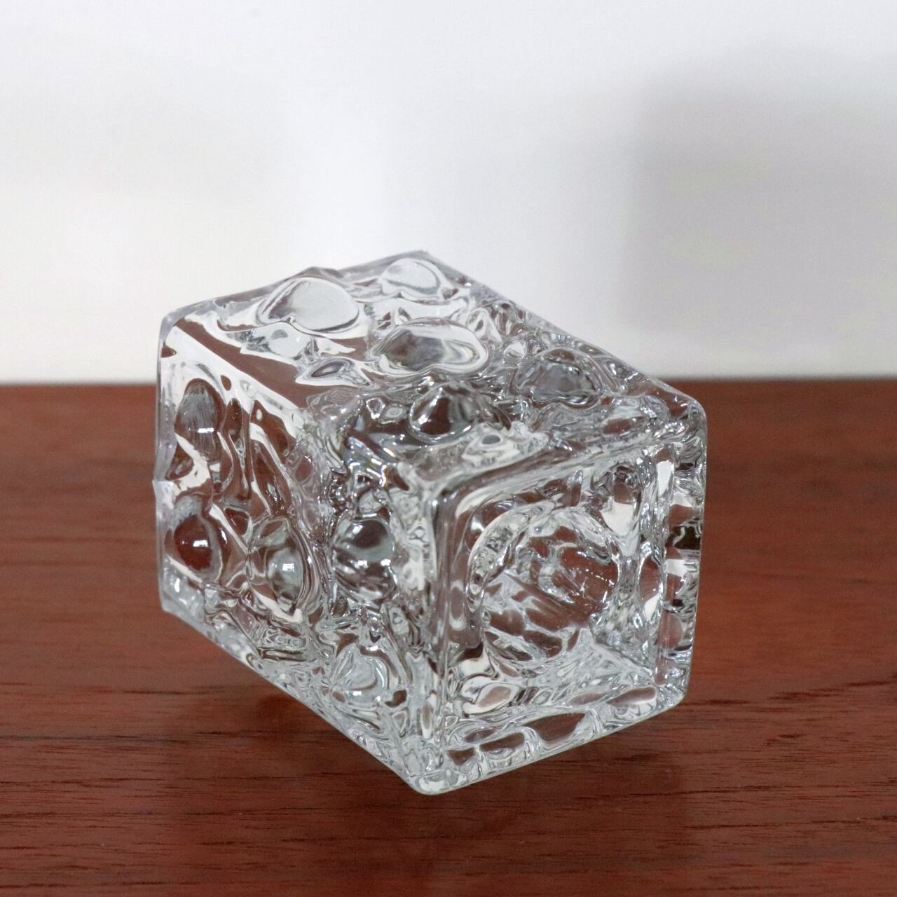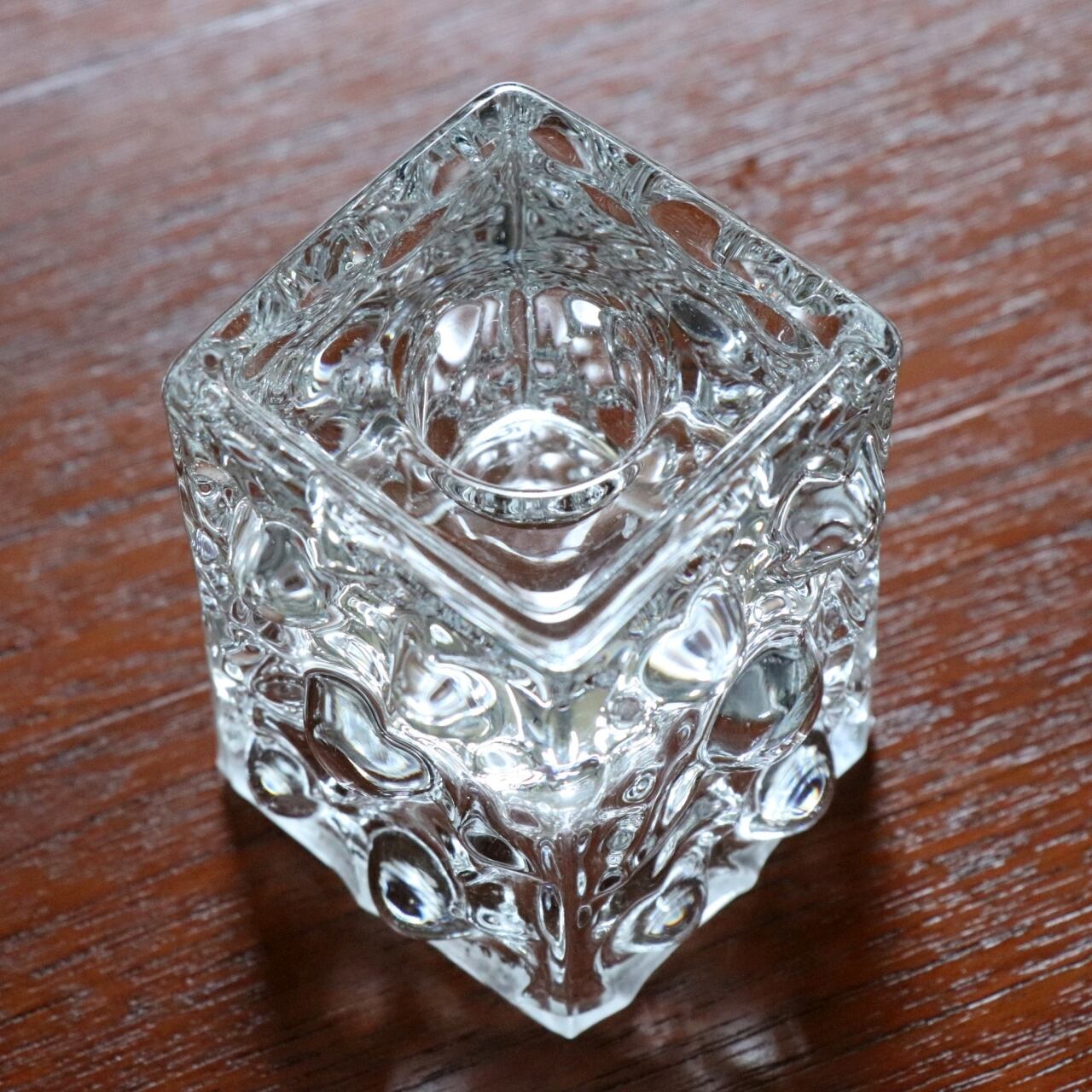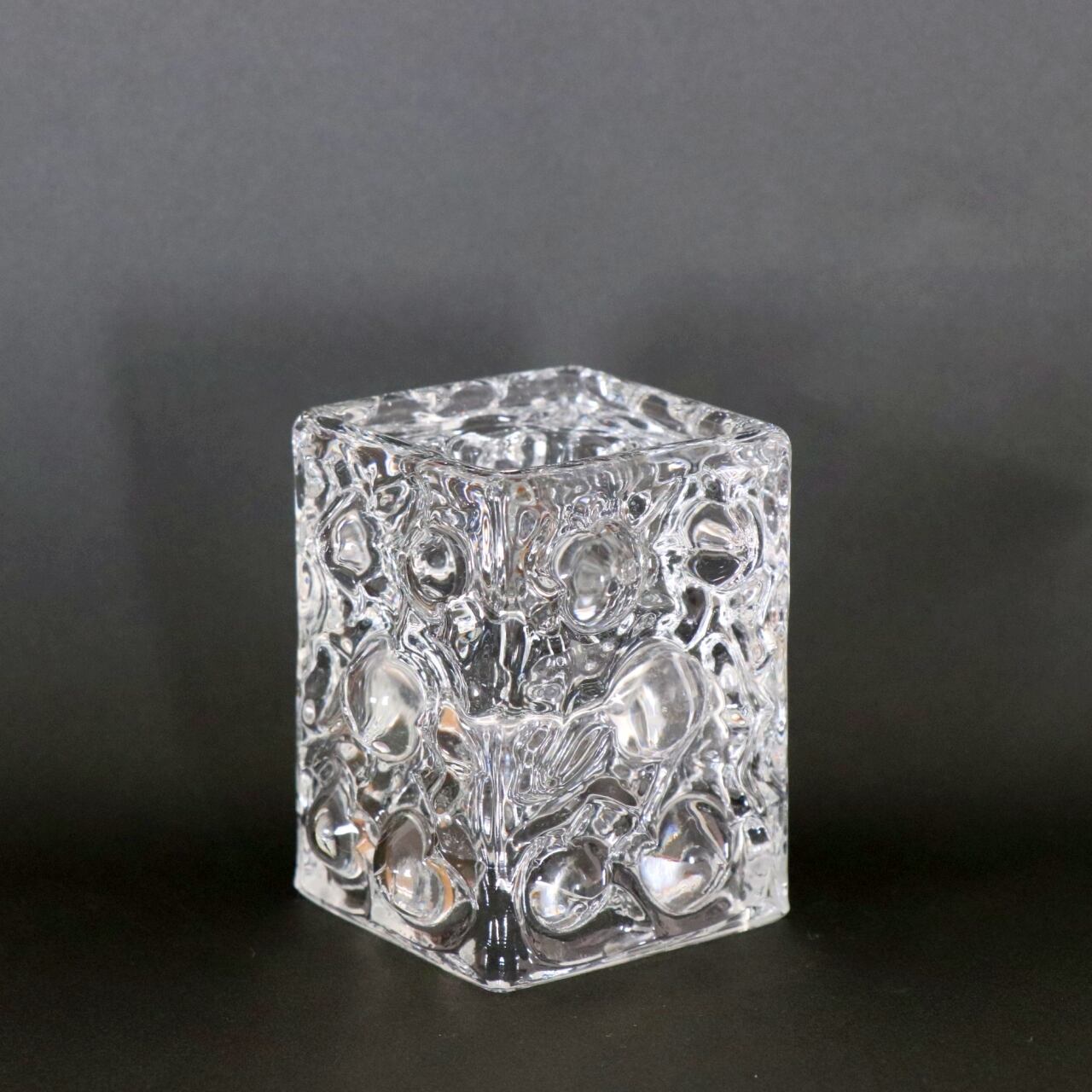 立体感のある泡状のフォームの上下がキャンドルスタンドになっており、一方は45mm角でボーティブキャンドルやティーライトキャンドル用に、逆側は中央に25mmほどの穴が開いておりキャンドルを立てられるようなデザインです。製造の難易度が高いフォルムですがガラスの質は高く、透明感のある仕上がりです。
