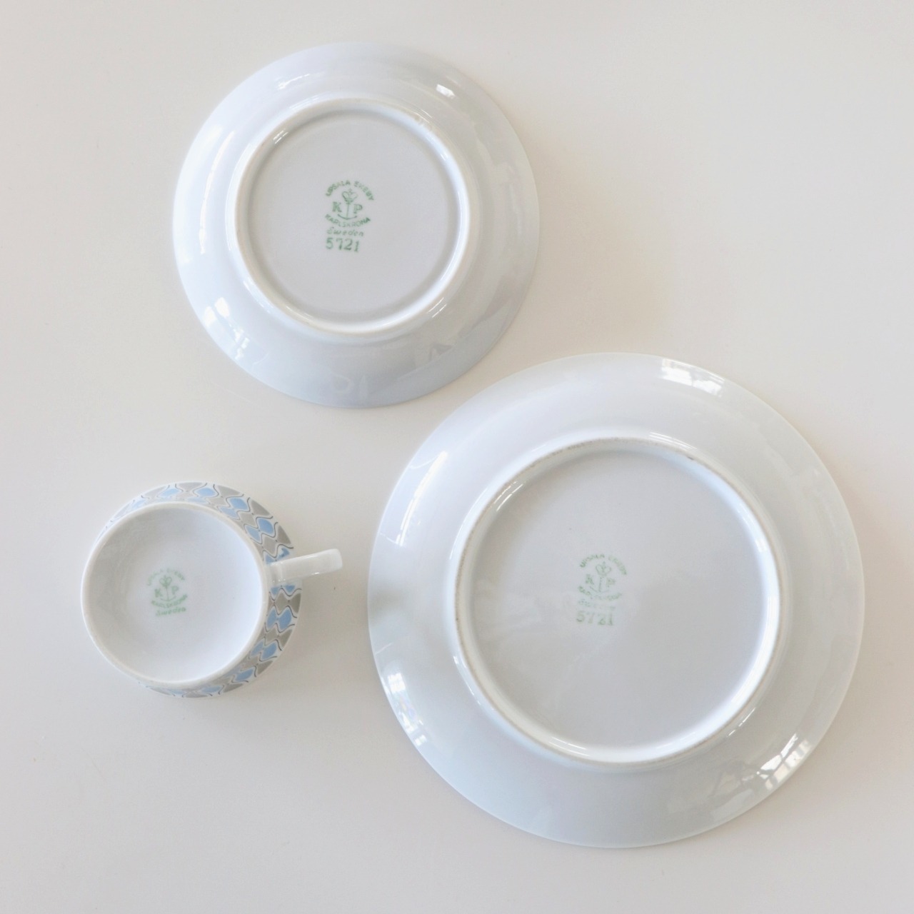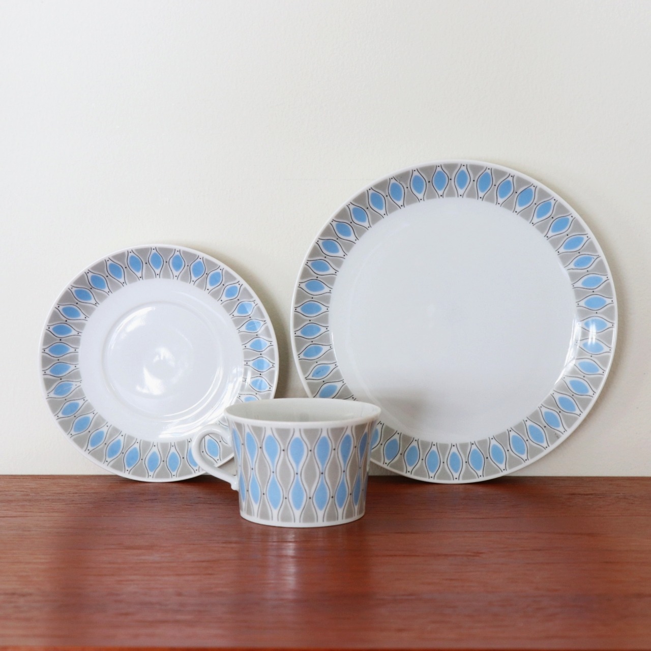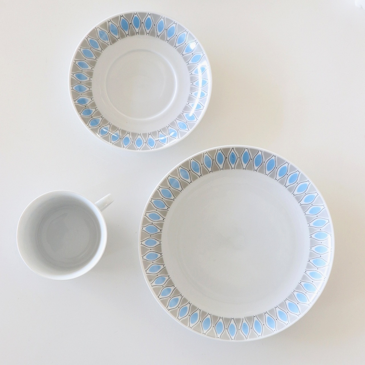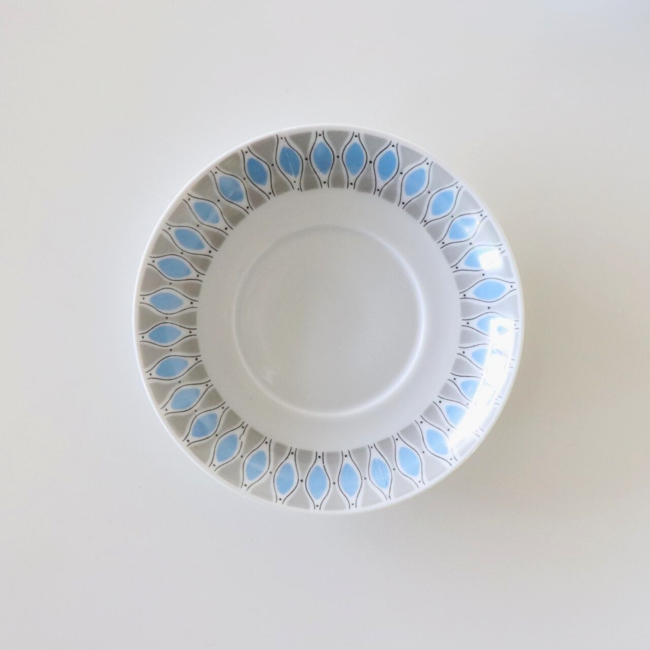 幾何模様がレトロでポップなこのデザイン。残念ながらシリーズ名やデザイナーの名前などが特定できませんでしたが、薄手で上品な北欧ミッドセンチュリーらしい美しいシリーズです。同等のコンディションで複数入荷しています。