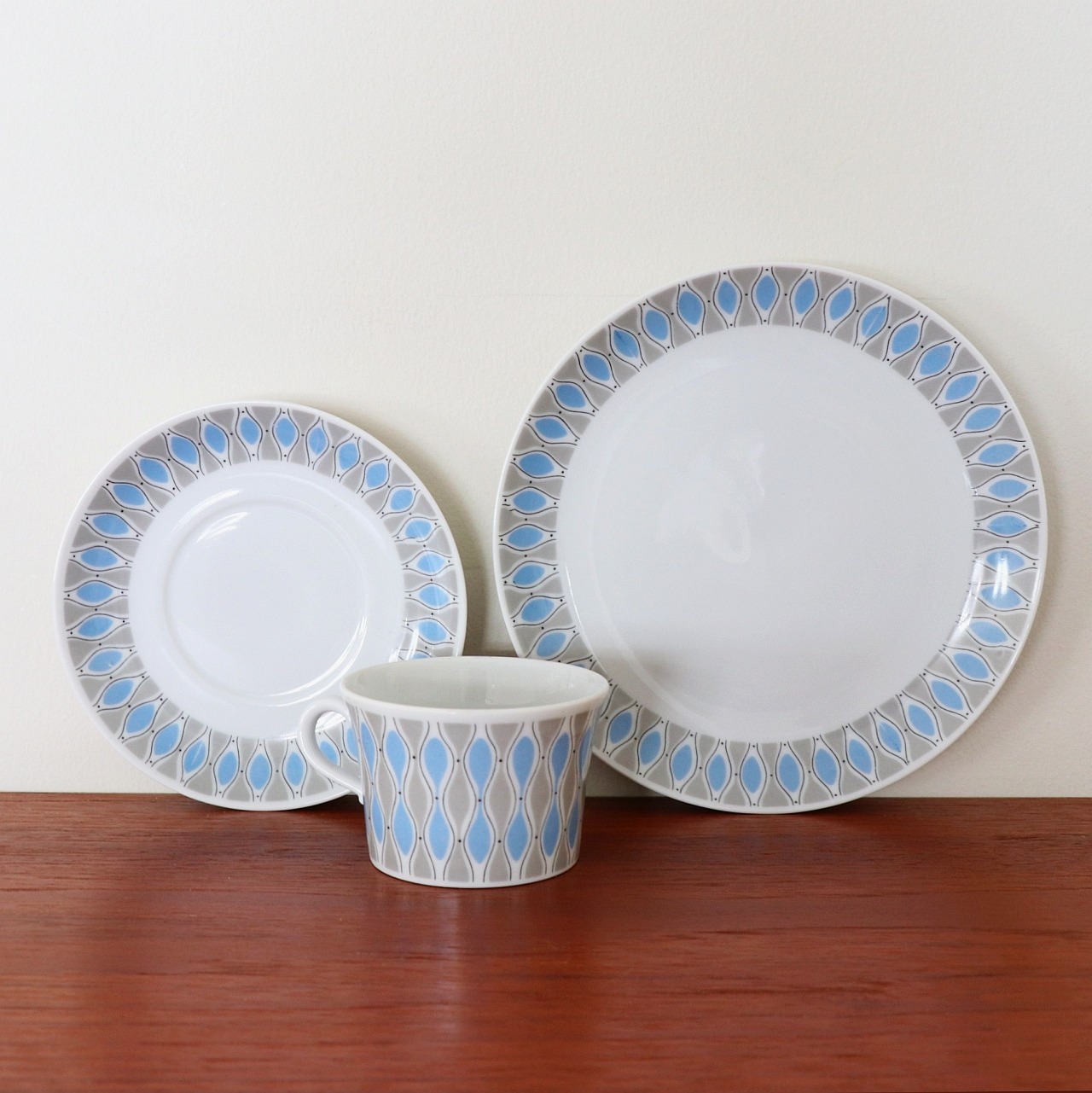 幾何模様がレトロでポップなこのデザイン。残念ながらシリーズ名やデザイナーの名前などが特定できませんでしたが、薄手で上品な北欧ミッドセンチュリーらしい美しいシリーズです。同等のコンディションで複数入荷しています。