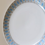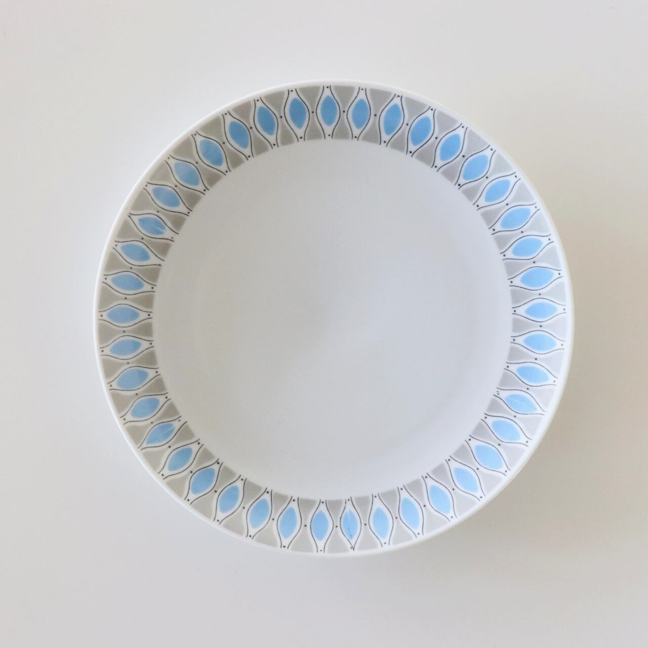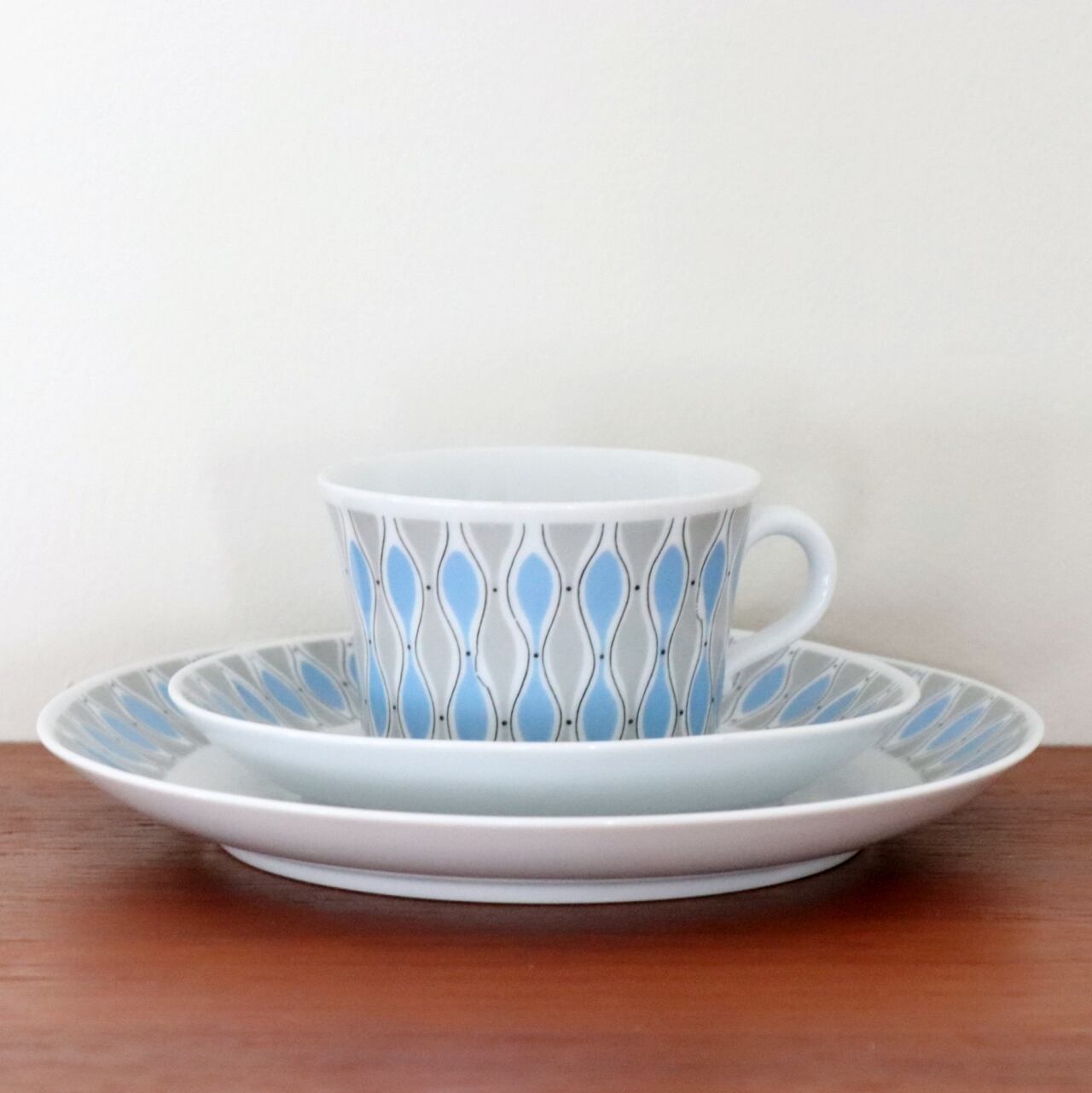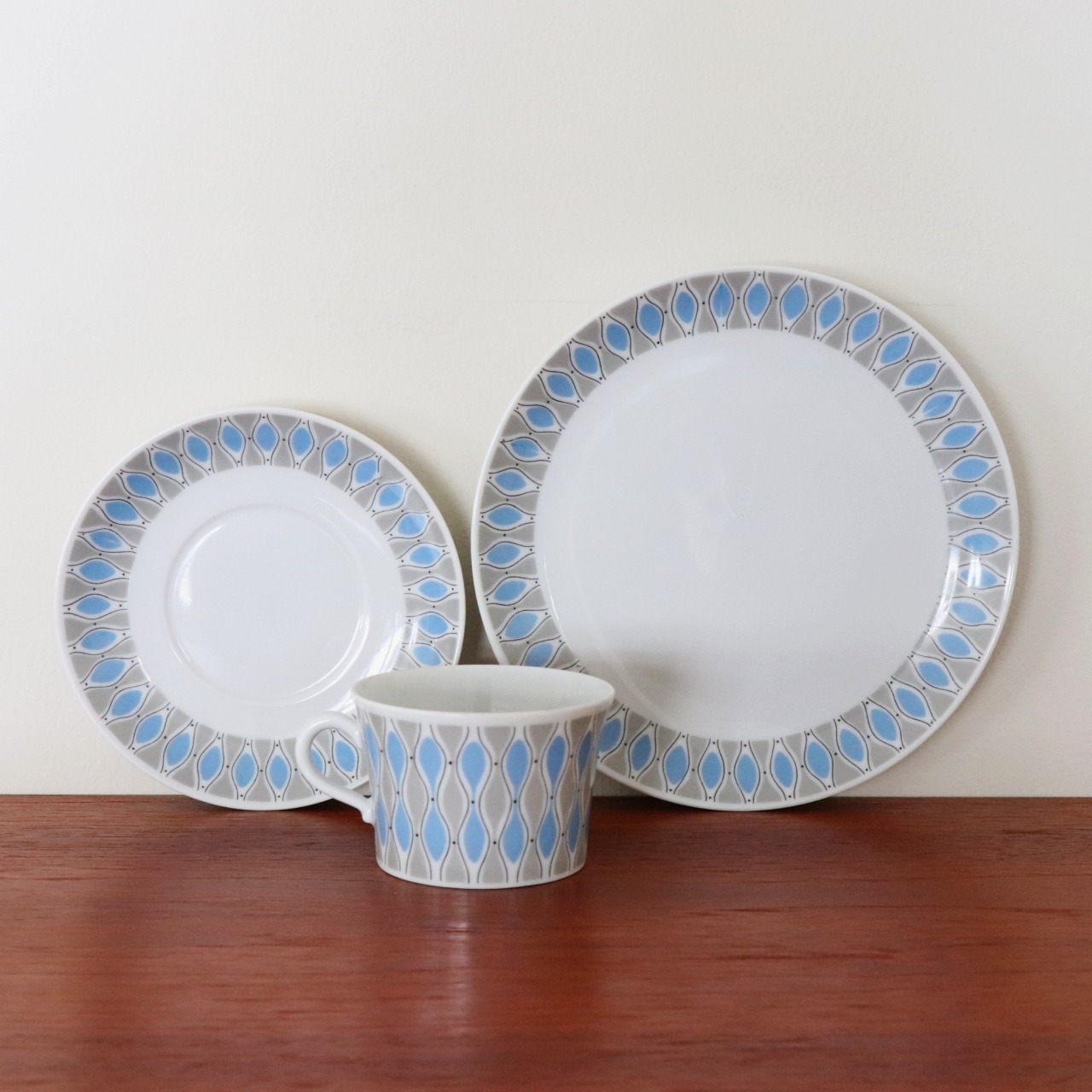 幾何模様がレトロでポップなこのデザイン。残念ながらシリーズ名やデザイナーの名前などが特定できませんでしたが、薄手で上品な北欧ミッドセンチュリーらしい美しいシリーズです。同等のコンディションで複数入荷しています。