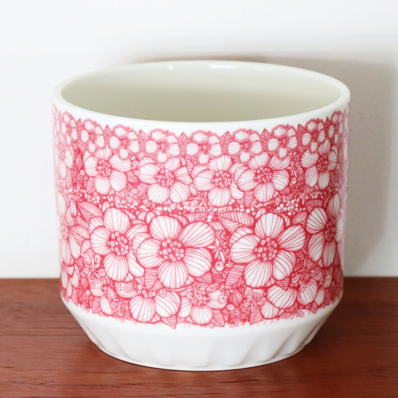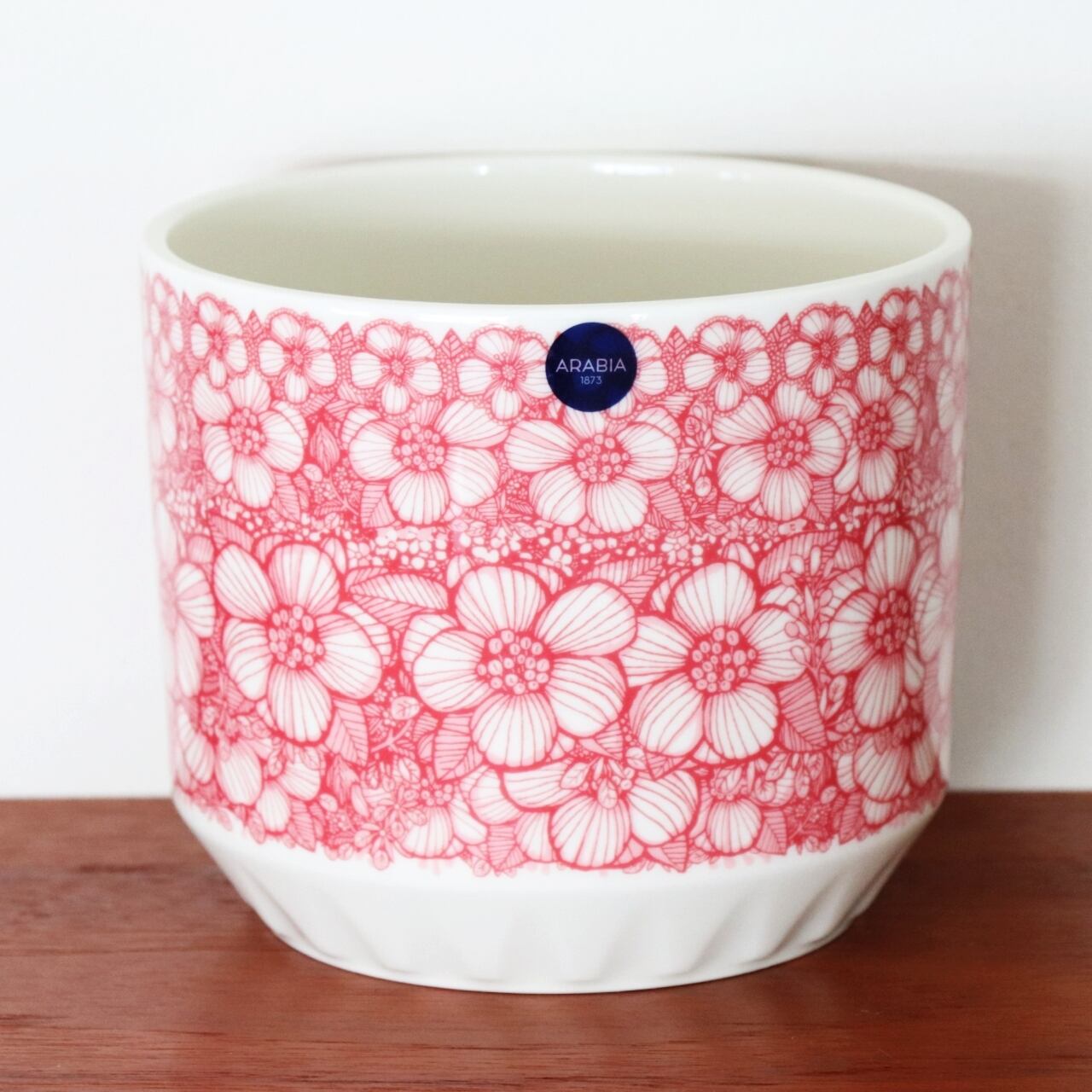 2017年に制作された「フィンランド独立100周年記念マグ」の10種類の絵柄のひとつ、フヴィラ。 ヘイニ・リータフフタはフィンランド出身のデザイナーで、アラビア・アートデパートメントにスタジオを構えるアーティストのひとりです。彼女の作品は世界各国で高く評価されており、日本の美濃においては名誉賞を受賞しています。 フヴィラはヘイニの祖母のコテージにインスピレーションを得たデザインで、アラビアの古い装飾技法に興味を持ったヘイニが昔ながらのフリーハンドで描いた花模様です。野薔薇をベースにした優しいピンクの花々は1920年代のアラビアビンテージの雰囲気を漂わせています。