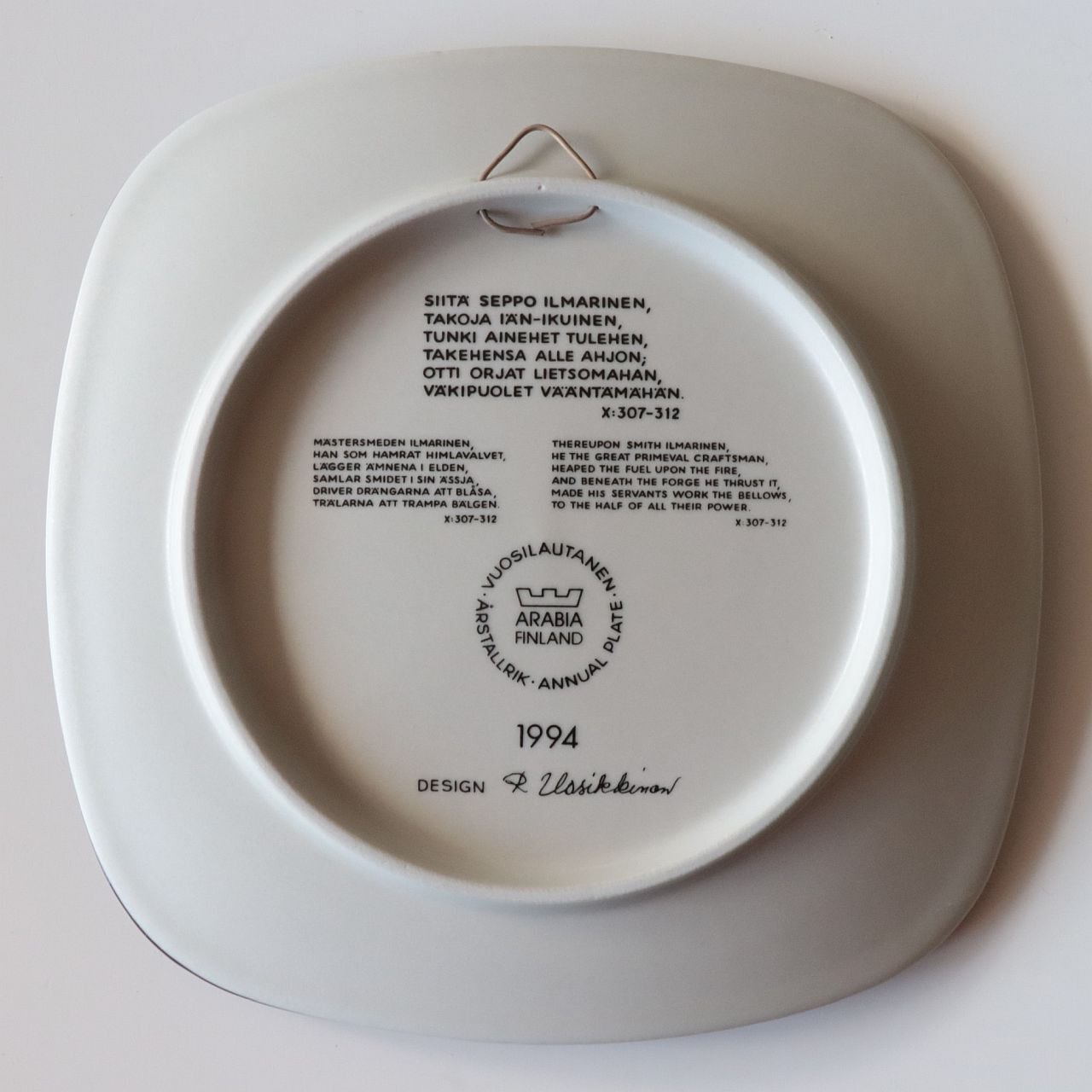 1976年から1999年にかけて、フィンランドの名窯Arabia(アラビア)で製作されたKalevala(カレワラ)シリーズのイヤープレート。第19作目にあたる1994年のプレートは、フィンランド神話における鍛冶の神イルマリネンの創造の場面を描いています。デザインはRaija Uosikkinen(ライヤ・ウオシッキネン)。