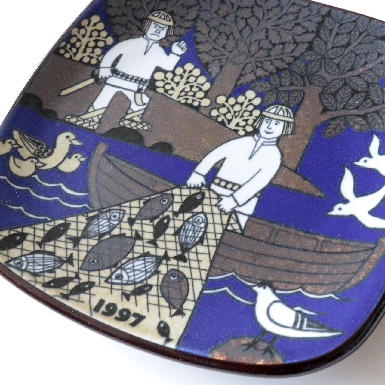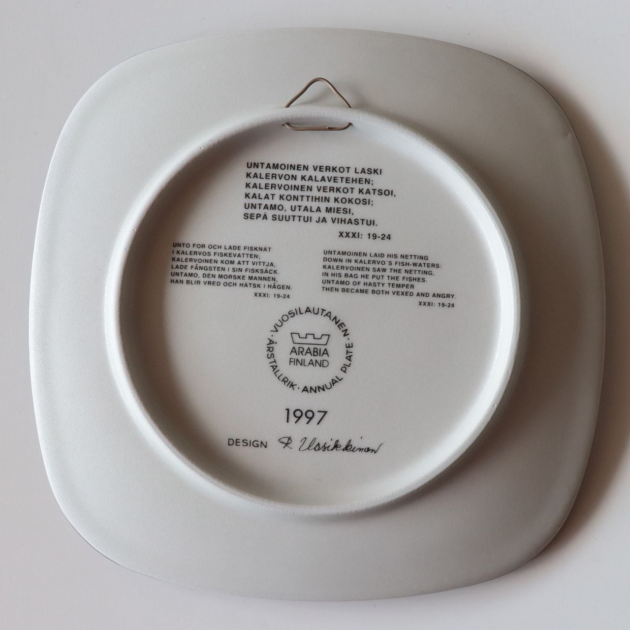 1976年から1999年にかけて、フィンランドの名窯Arabia(アラビア)で製作されたKalevala(カレワラ)シリーズのイヤープレート。第22作目にあたる1997年のプレートは、カレワラの中でも対立と怒りの芽生えを描いた場面を取り上げています。デザインはRaija Uosikkinen(ライヤ・ウオシッキネン)。
