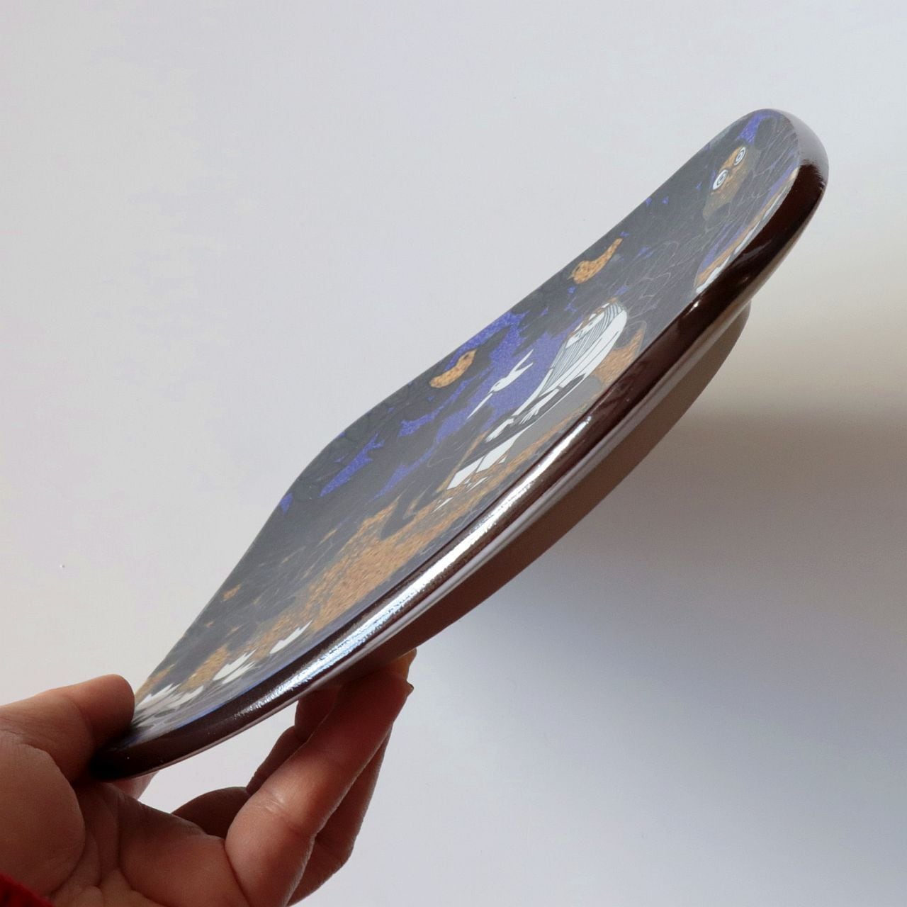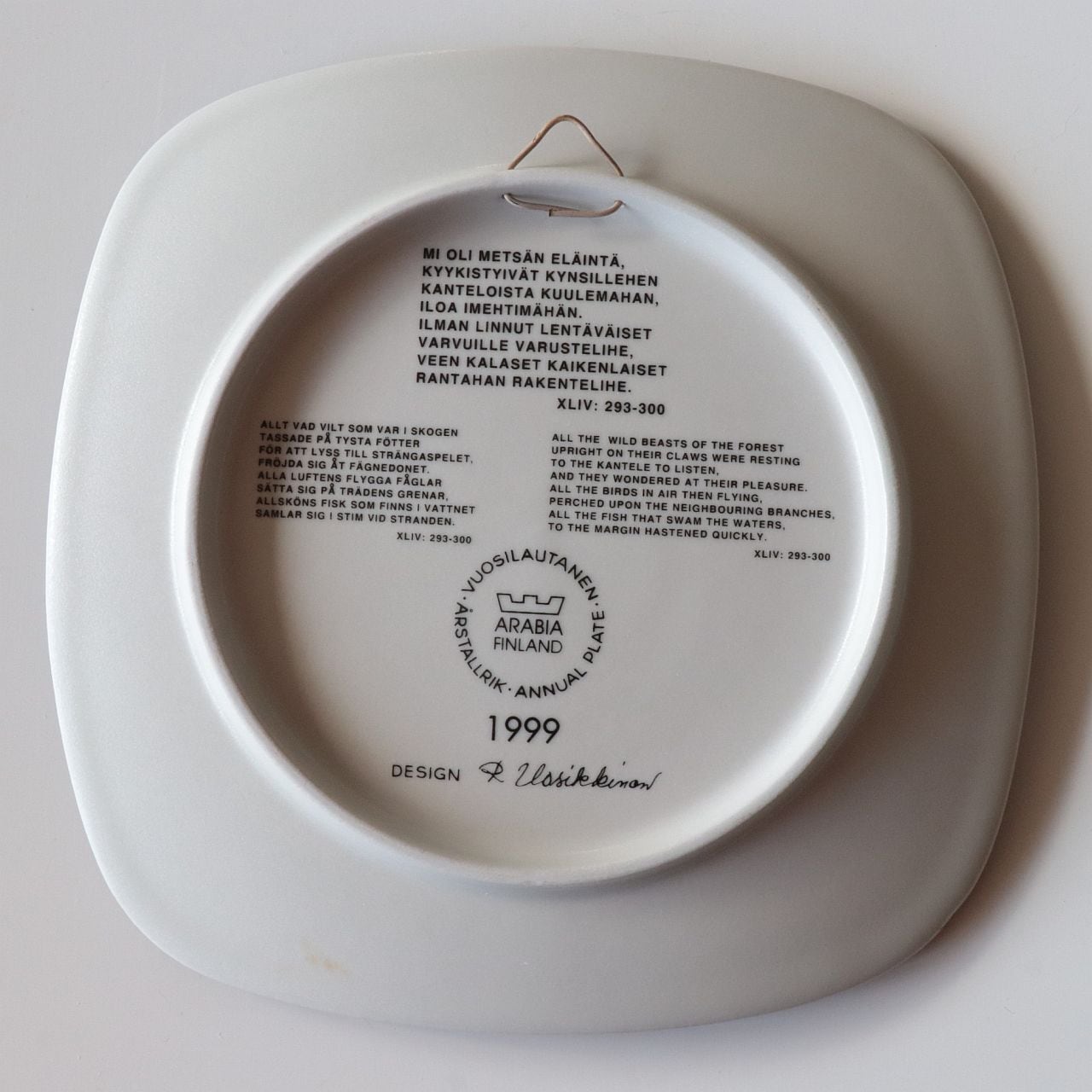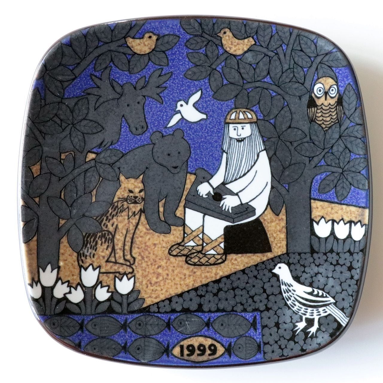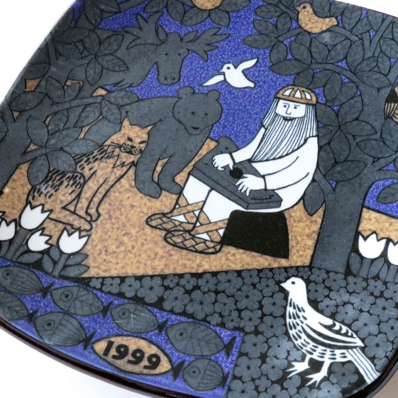 1976年から1999年にかけて、フィンランドの名窯Arabia(アラビア)で製作されたKalevala(カレワラ)シリーズの最終作。第24作目にあたる1999年のプレートは、シリーズの締めくくりにふさわしく、自然と音楽、そして調和の美しさを讃える詩的な場面を描いています。デザインはRaija Uosikkinen(ライヤ・ウオシッキネン)。