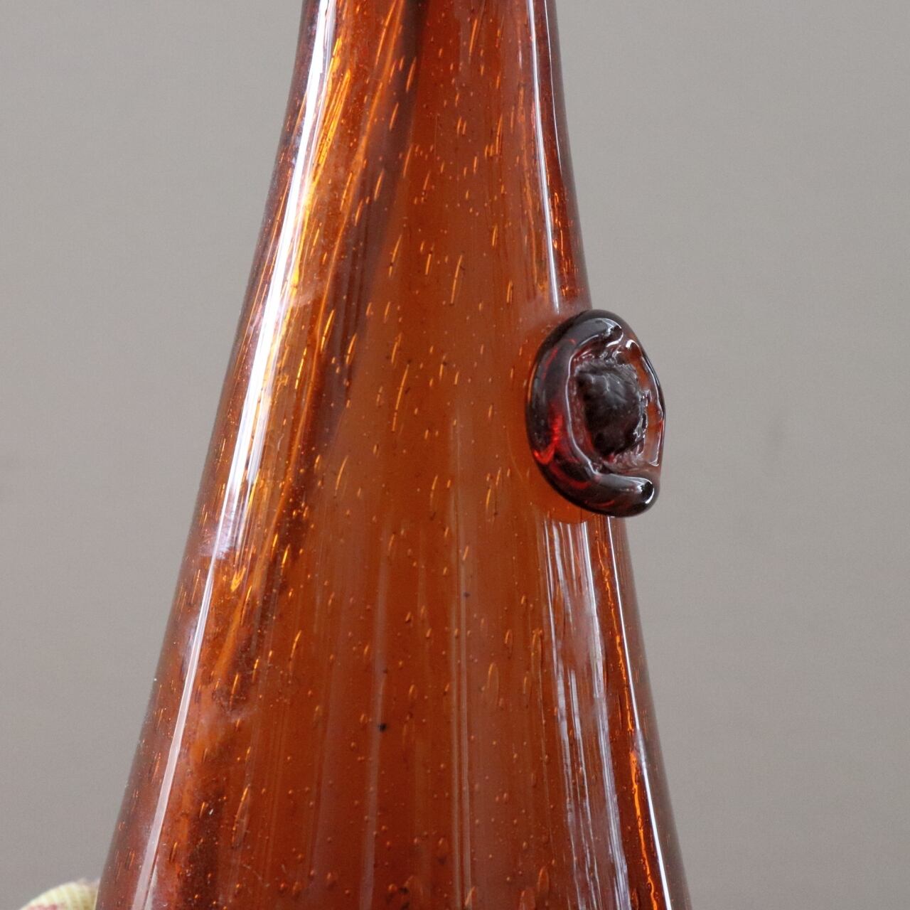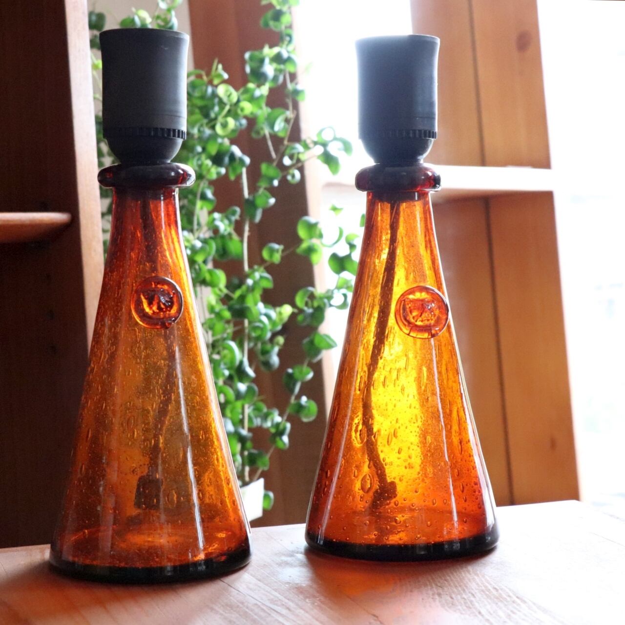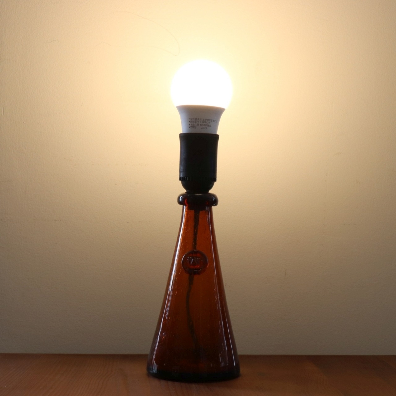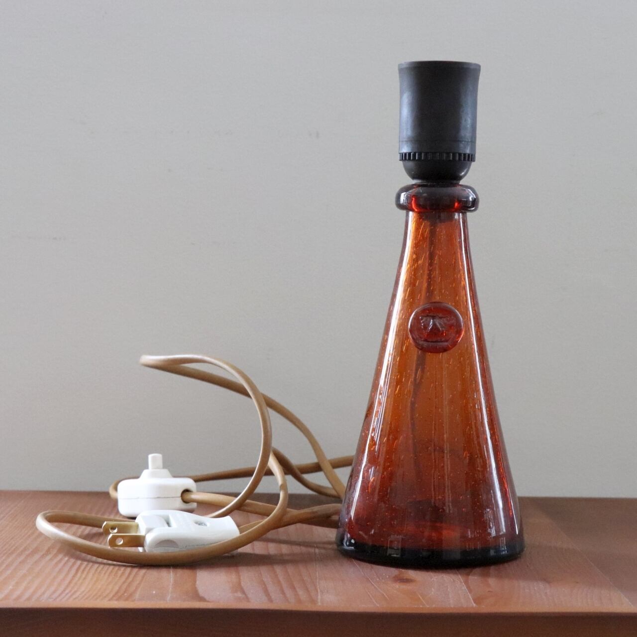 エリック・ホグランらしい大きく気泡の入った厚みの異なる琥珀色のガラス。光を通すことでベース部位は表情を変え、シンプルなデザインながらも独特の存在感を出すランプです。