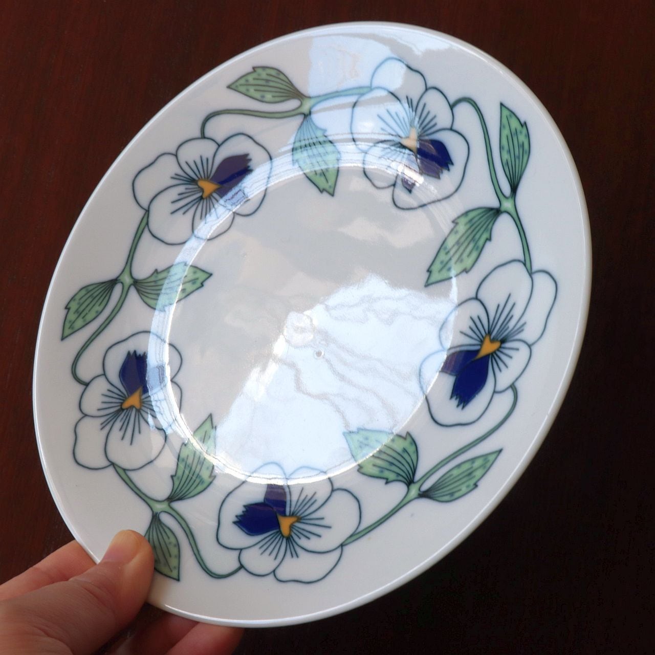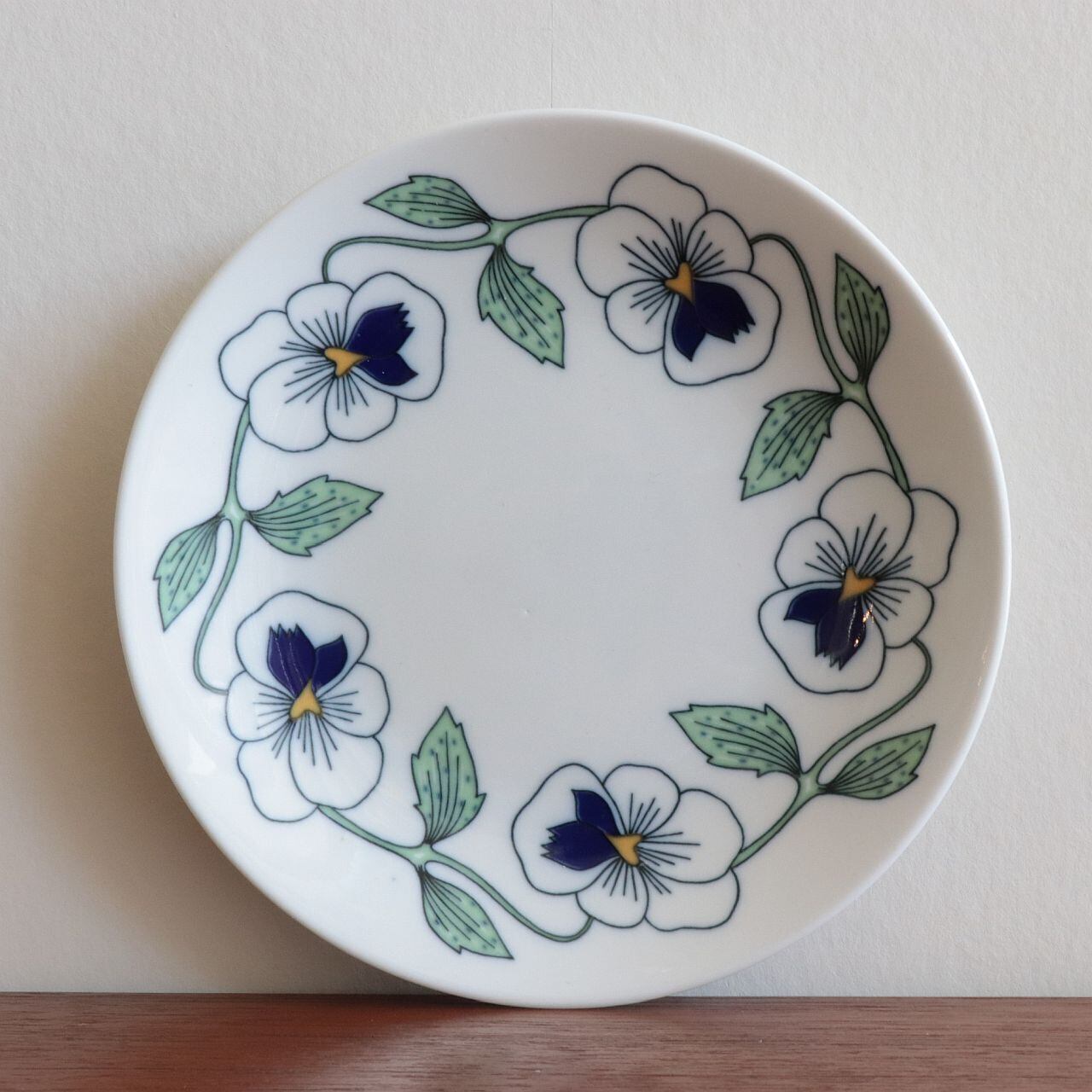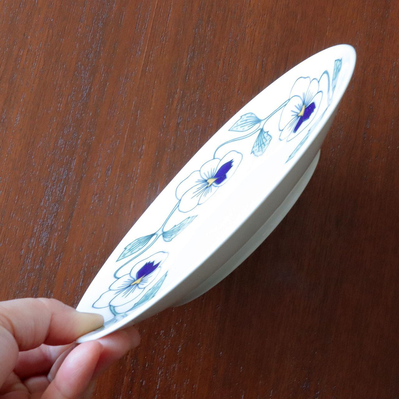 白磁の素地に繊細な筆致で描かれたスミレの花が、清楚で可憐な印象を与えるデザイン。花弁の淡い紫と黄色のコントラストが、静かな華やかさを添えています。薄作りのボーンチャイナがもたらす軽やかな手触りと、透けるような釉薬の美しさも魅力のひとつです。