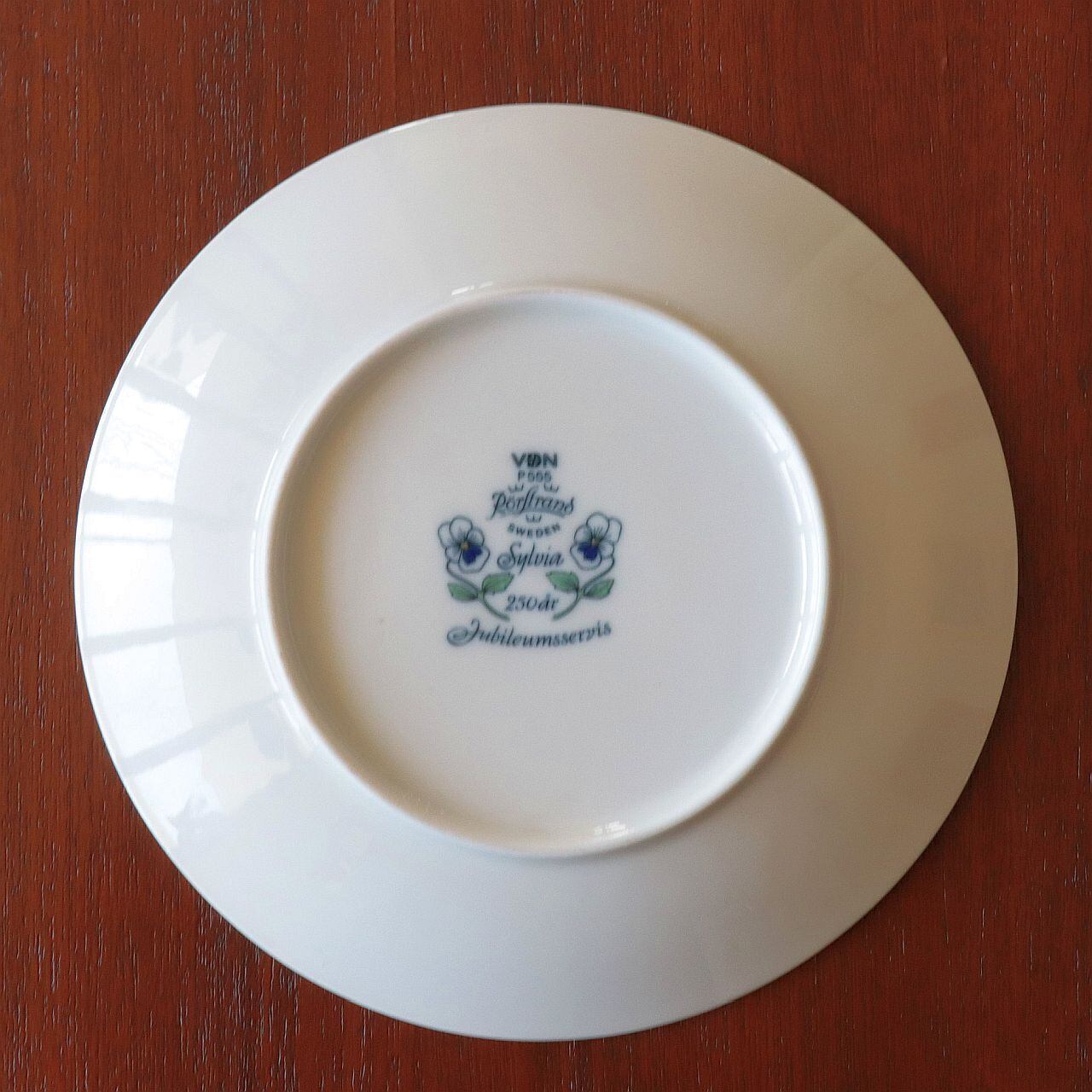 このシリーズは、スウェーデン国王カール16世グスタフとシルビア王妃の婚約と同年の発表となり、もともと王立として創業されたロールストランド社の記念と、新王妃の名前との重なりでより印象深い作品としてスウェーデン国内に知れ渡ったシリーズです。裏面には「250 år Jubileumsservis(250周年記念テーブルウェア)」の刻印が施され、記念モデルならではの特別感を漂わせています。