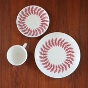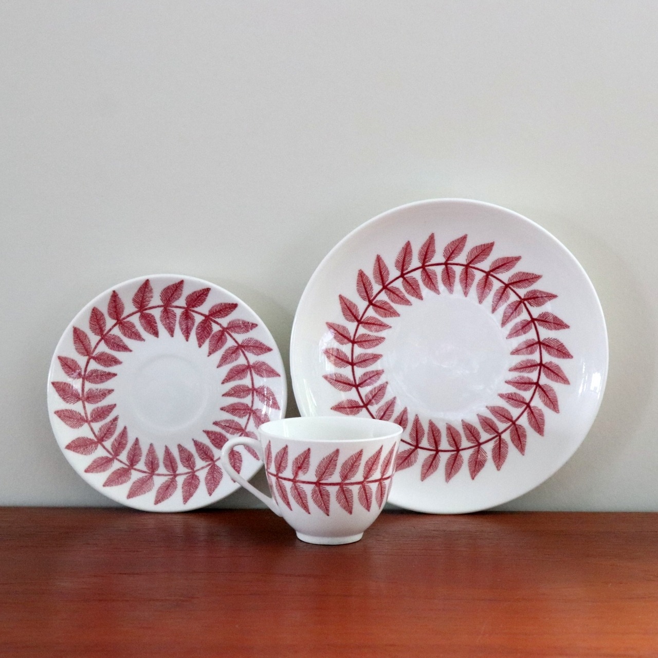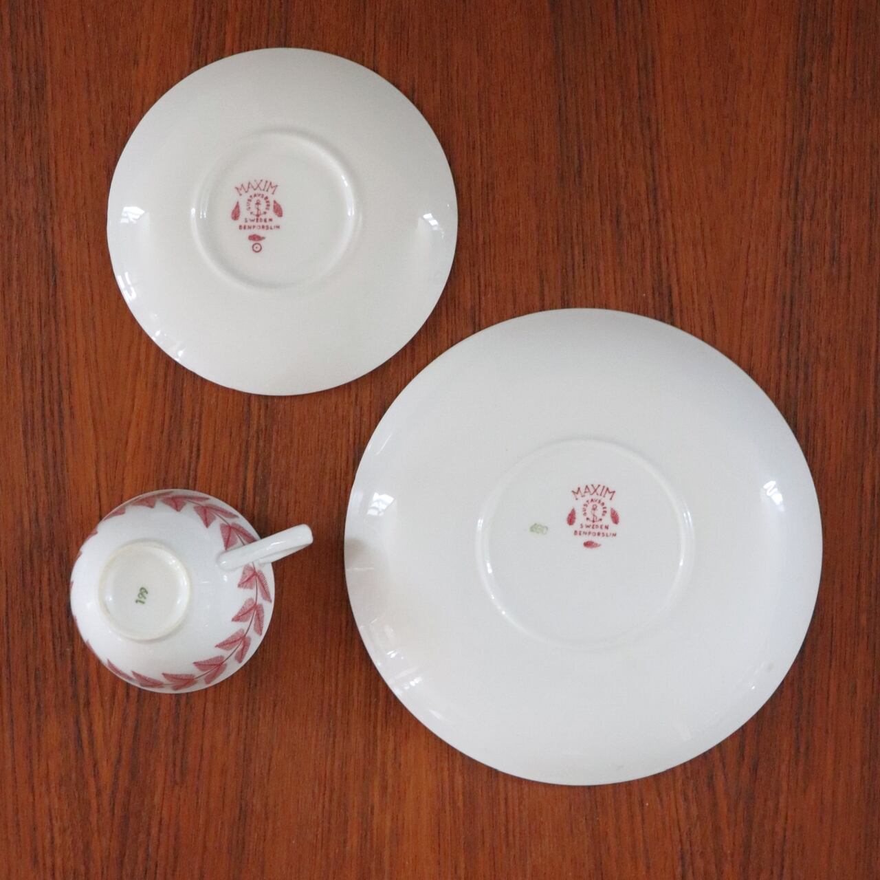 1960-63年の間にスウェーデンのグスタフスベリで製作されたMaxim。フォルムデザインはStig Lindberg(スティグ・リンドベリ)が、デコレーションデザインはBibi Breger(ビビ・ブレーゲル)が手がけたシリーズです。 少し掠れたような細かな線で描かれた葉っぱの柄。赤と黒の2カラーで製作されています。