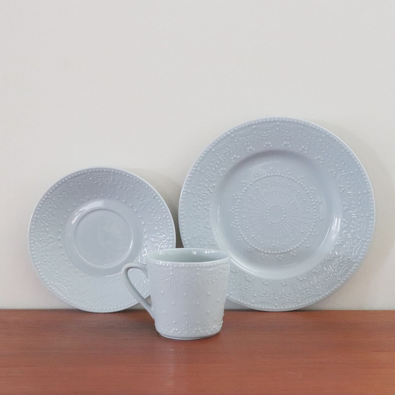 エンボス模様のみで仕上げられた同シリーズはライト(ベージュ)とブルーグレーの2色展開で製作されました。 フォルムデザインのベースにはVuokkoと同じOTモデルが選ばれています。アラビアとしては珍しいデザインで、華やかで上品な模様がとても美しいシリーズです。