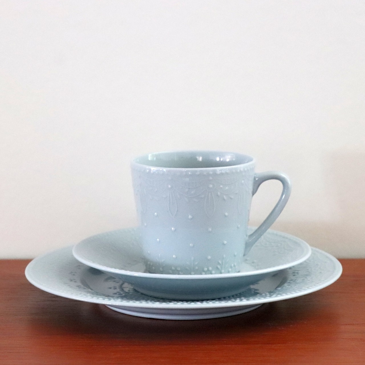 エンボス模様のみで仕上げられた同シリーズはライト(ベージュ)とブルーグレーの2色展開で製作されました。 フォルムデザインのベースにはVuokkoと同じOTモデルが選ばれています。アラビアとしては珍しいデザインで、華やかで上品な模様がとても美しいシリーズです。