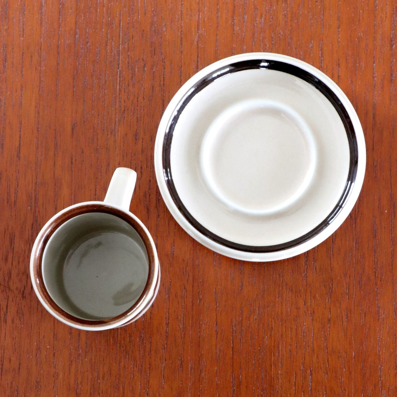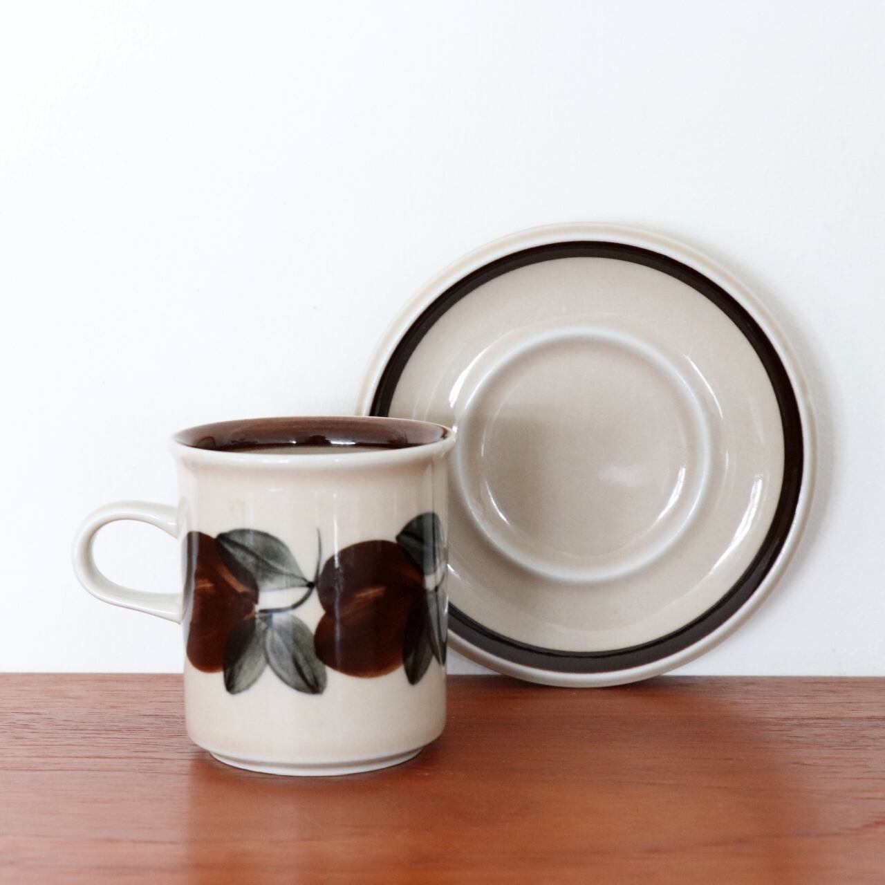 1975-81年年の間、フィンランドのARABIAで製作されたRuija(ルイヤ)。 ウッラ・プロコペ(Ulla Procope)がフォルムデザイン、ライヤ・ウオシッキネン(Raija Uosikkinen)がデコレーションデザインをしたシリーズです。 ベージュの落ち着いた素地に茶色の暖かみのある花が手描きで描かれています。