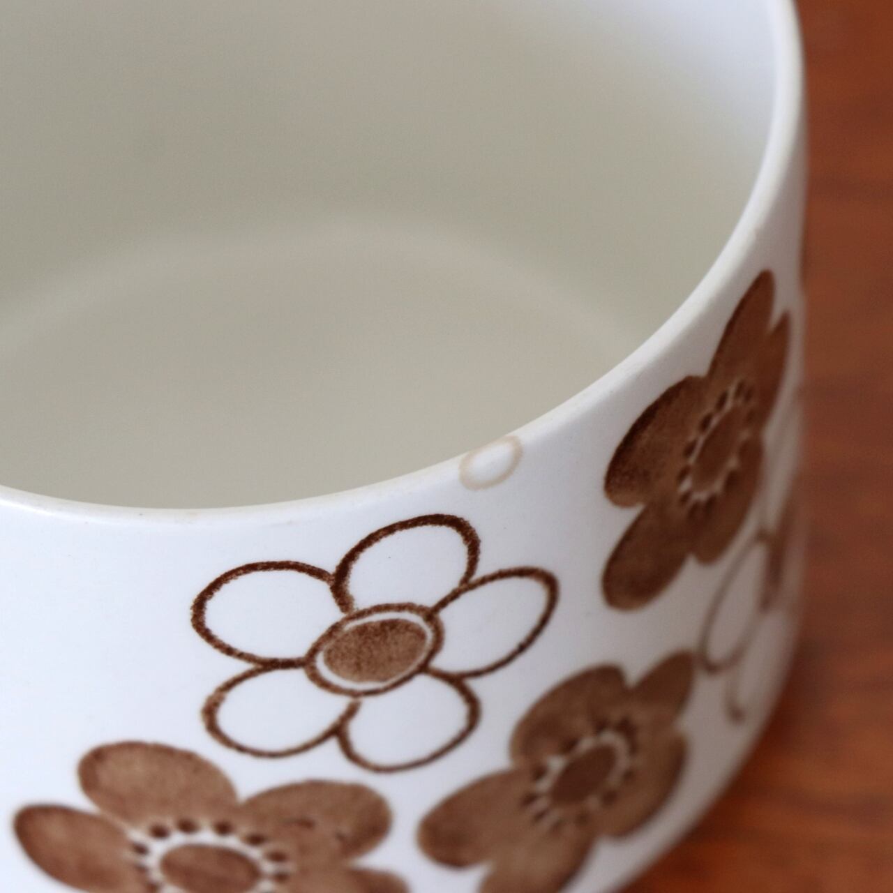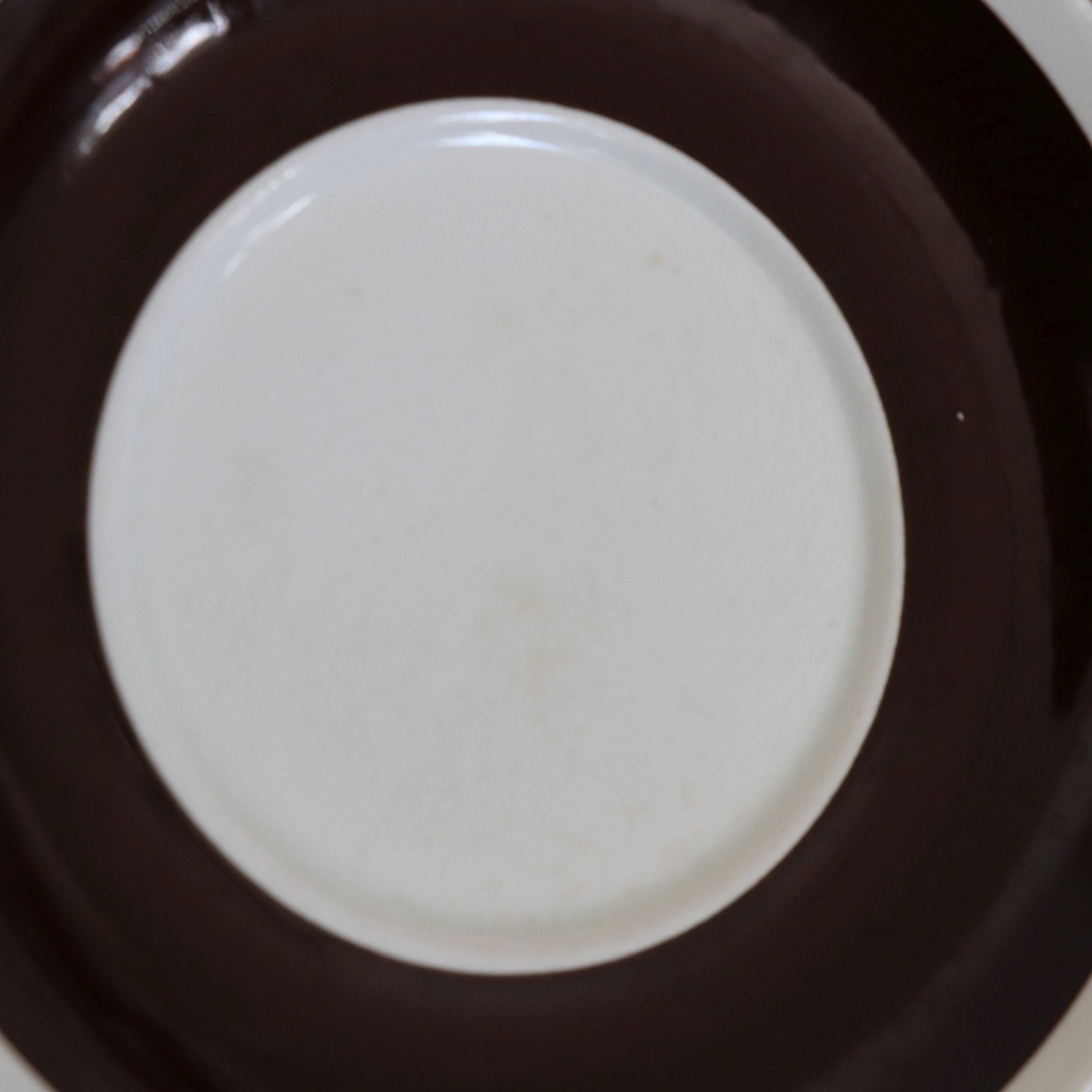 掠れたような独特のテクスチャで描かれた花模様が特徴的です。白地にブラウンが中心ですが、花柄がブルーとなったパターンも製作されています。パターンの花柄はスクリーンプリントで、縁取りやディーププレートの中央部は筆や刷毛で描いたもので、かすれ具合や柄の出方がそれぞれ少しずつ異なっています。同様の仕上げはロールストランド社でも他に例が無く、どの機械を使って仕上げたものかは不明とされている不思議なシリーズです。