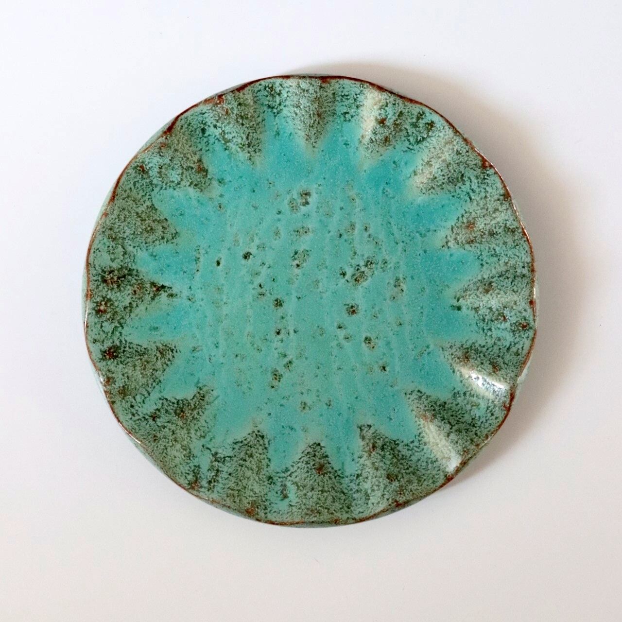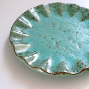 スウェーデンから届いたプレート。素朴な素地にエメラルド色の釉薬が使われた珍しいデザインです。リムは波型に成型されており、お皿の中央に上品に飾ることが出来そうです。