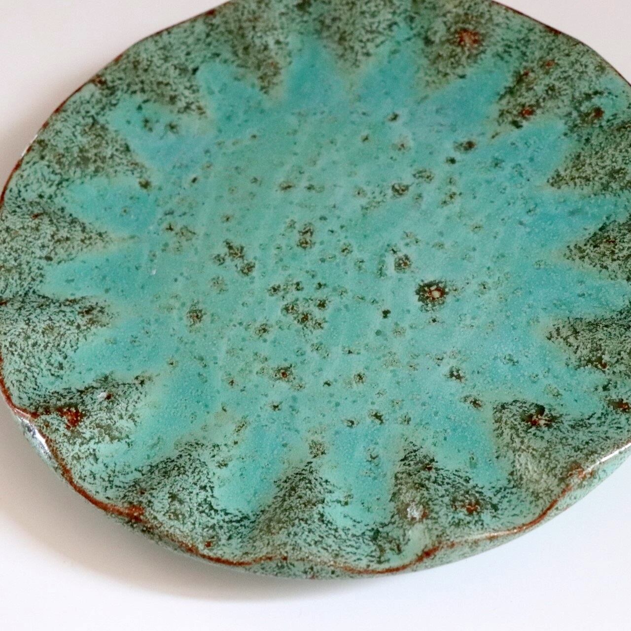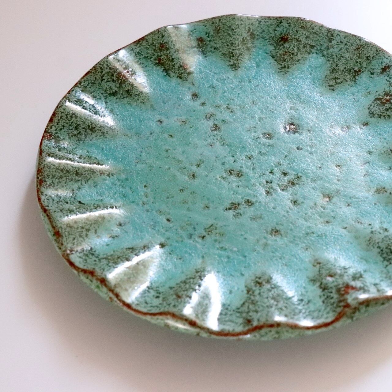 スウェーデンから届いたプレート。素朴な素地にエメラルド色の釉薬が使われた珍しいデザインです。リムは波型に成型されており、お皿の中央に上品に飾ることが出来そうです。