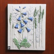 スウェーデンの陶器会社ジィガントフタ(jie gantofta)製の陶板。ブルーベルでしょうか、野に咲く釣り鐘型の小花が美しい作品です。 壁掛けが出来るよう背面に紐が通せる穴が開いています。