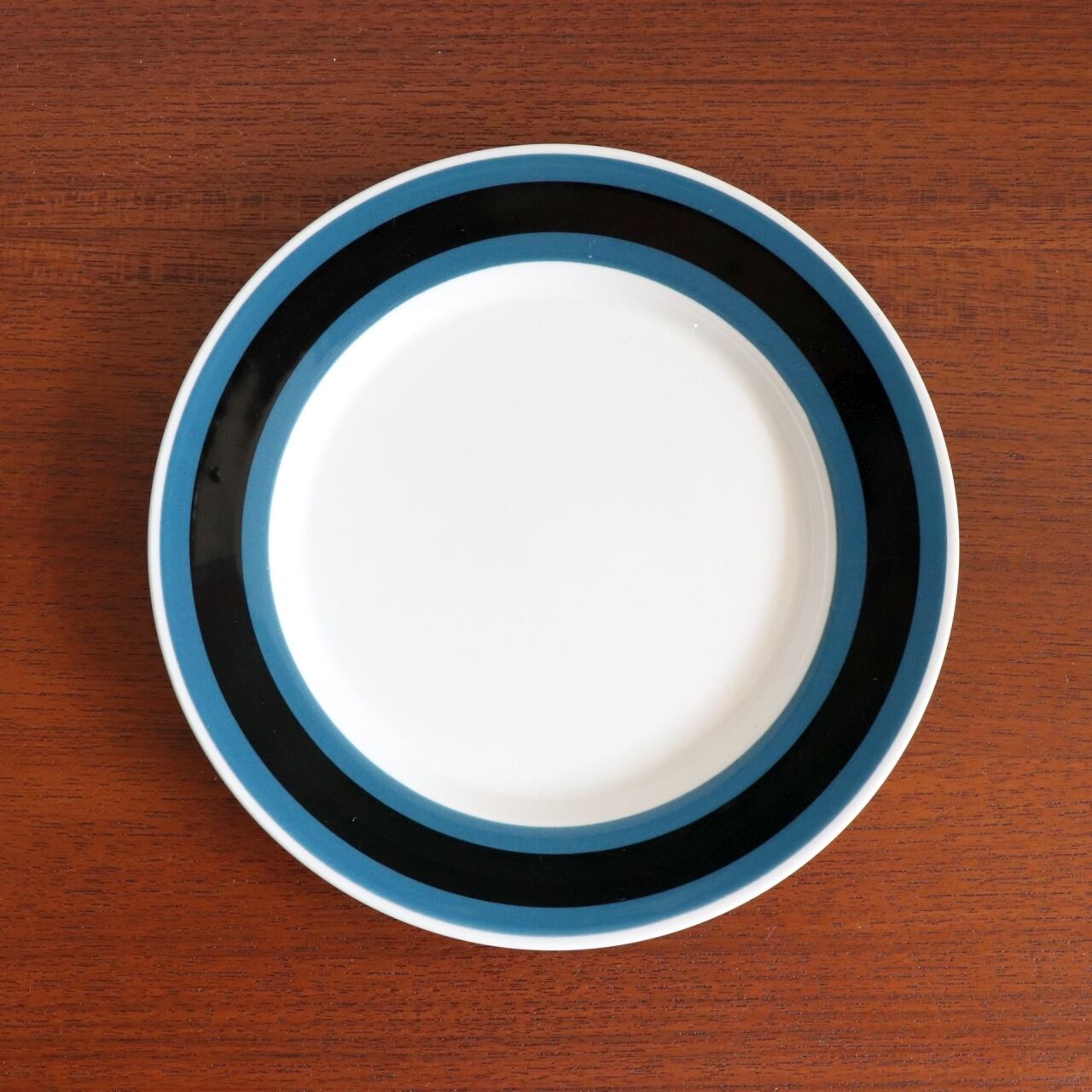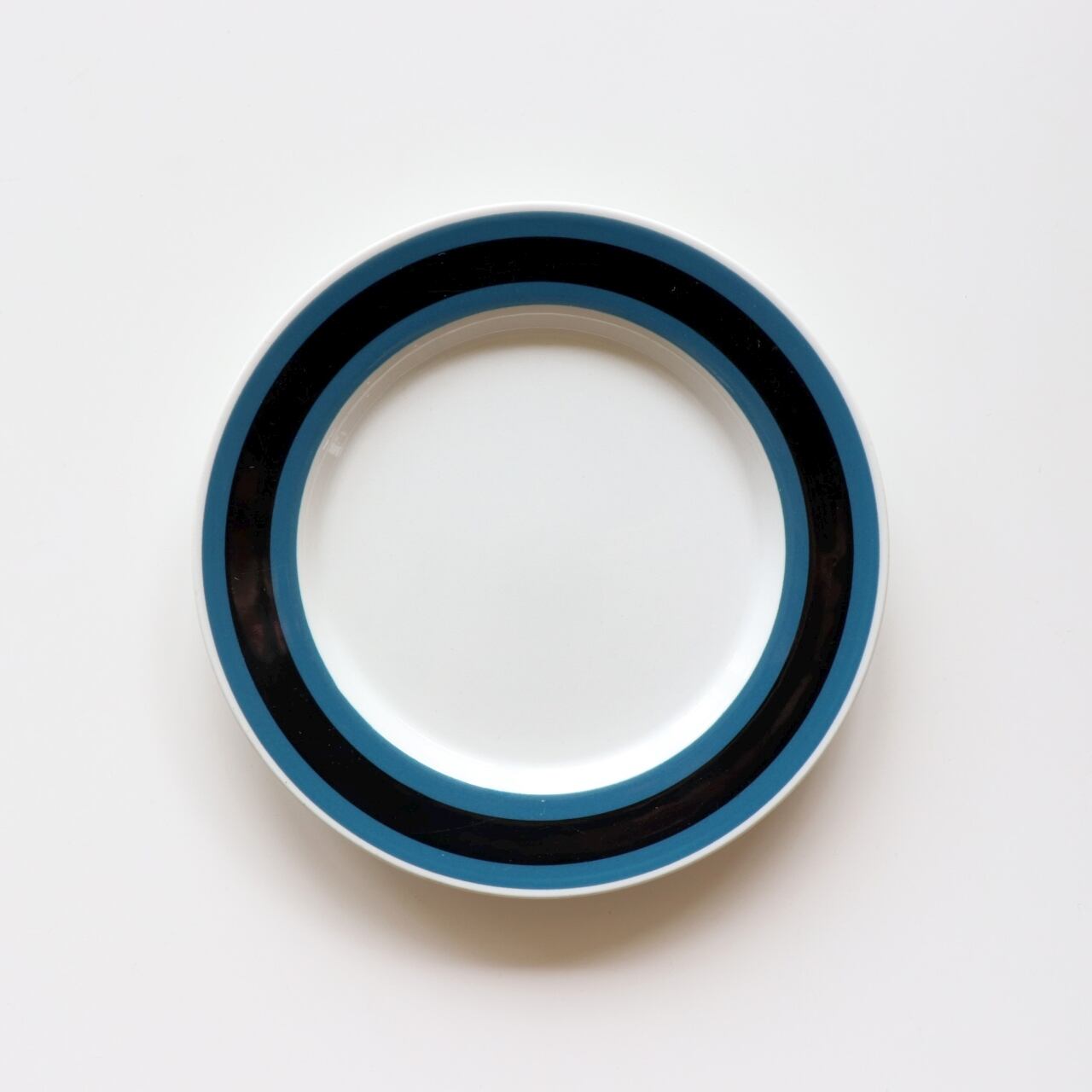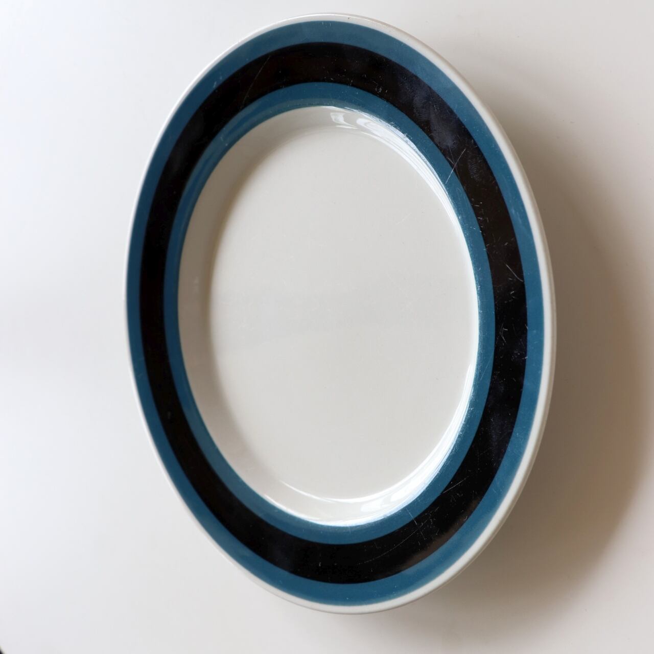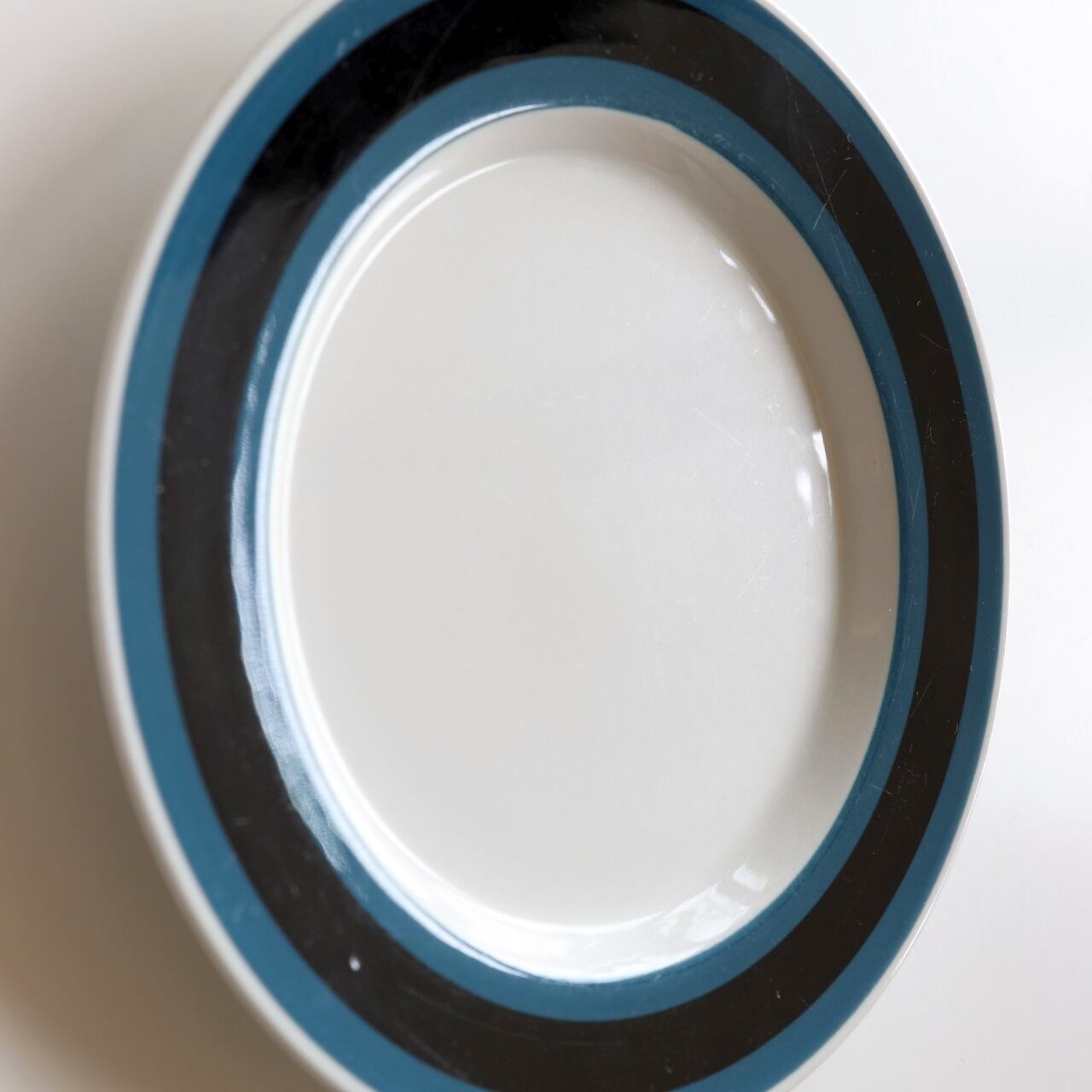 1964-71年の間に製作されたシリーズ“Kemi”。フォルムデザインはカーリナ・アホ、デコレーションデザインはオルガ・オソルが手がけています。 Kemi(ケミ)はフィンランドの中北部にある地域(都市)の名前から取られたのでしょうか。白と青と黒…潔く色のトーンだけで構成された普段使いにちょうど良いデザインです。