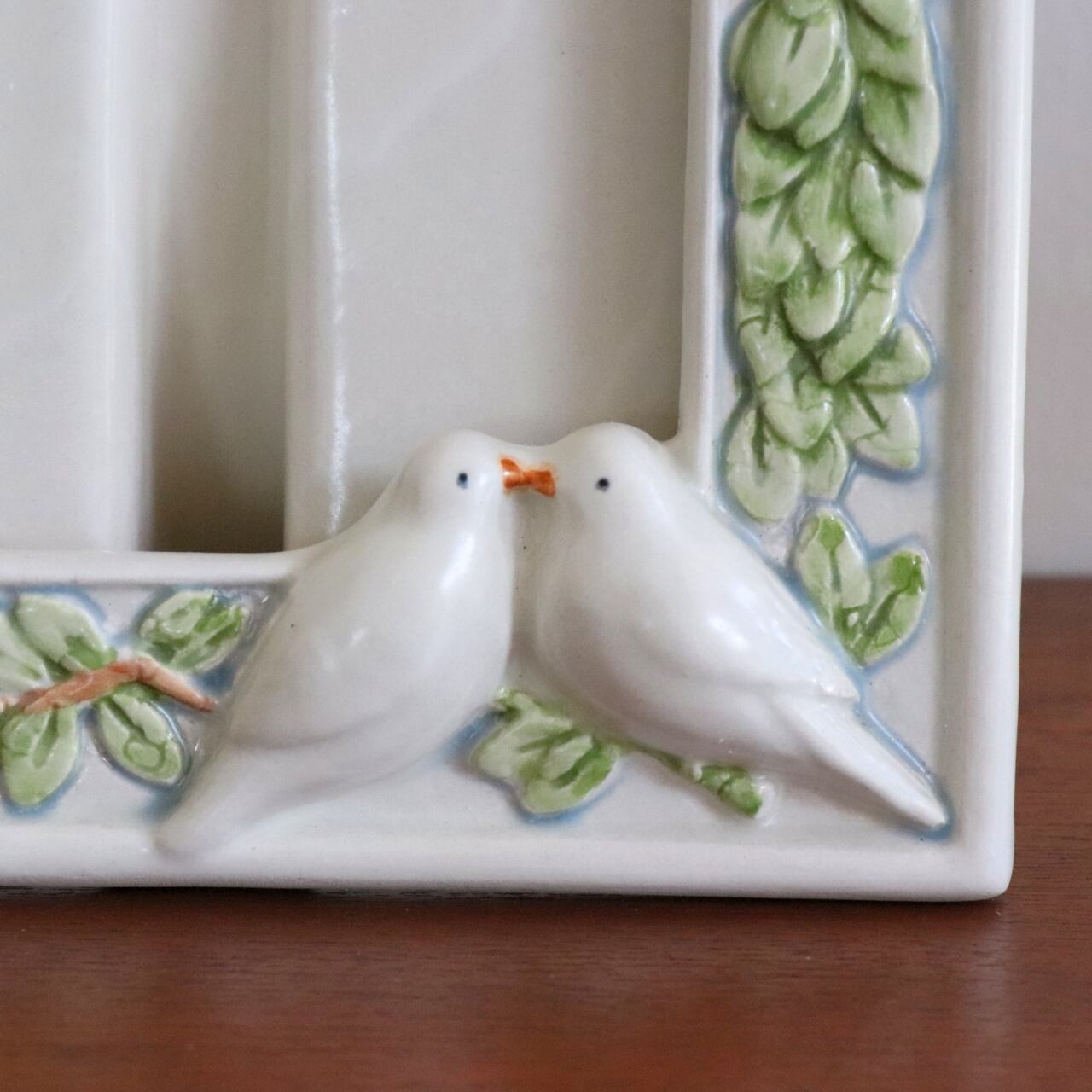 作品で、白地に立体的なハトとオリーブと思われる植物が装飾で描かれています。