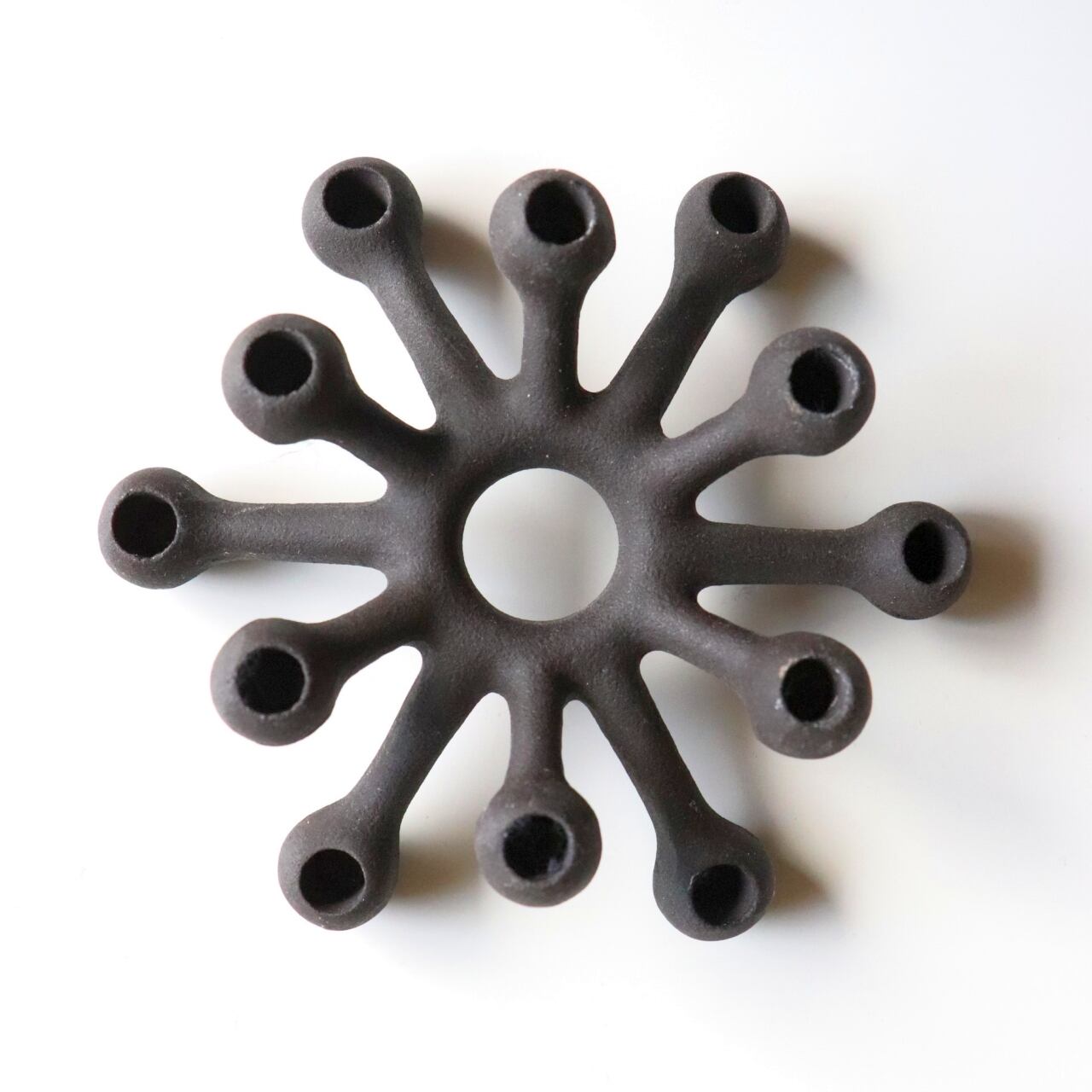 発売当初はTiny Taper、後にSpiderと名付けられたこちらは鋳鉄製の小さなキャンドルホルダーで、細いキャンドルを立てて使うように製作されています。Tiny Taperは約40種類のデザインから構成されたシリーズで、フォルムだけでなく鋳鉄や銀メッキ、クロムメッキ、真鍮無垢、エナメル加工と素材にもヴァリエーションをもって製作されています。