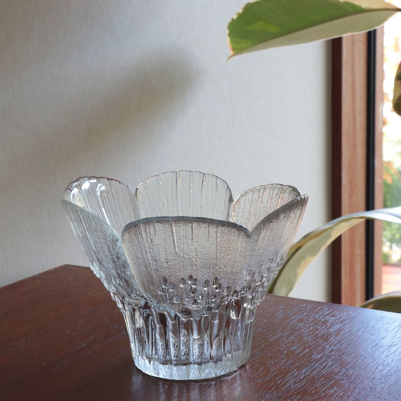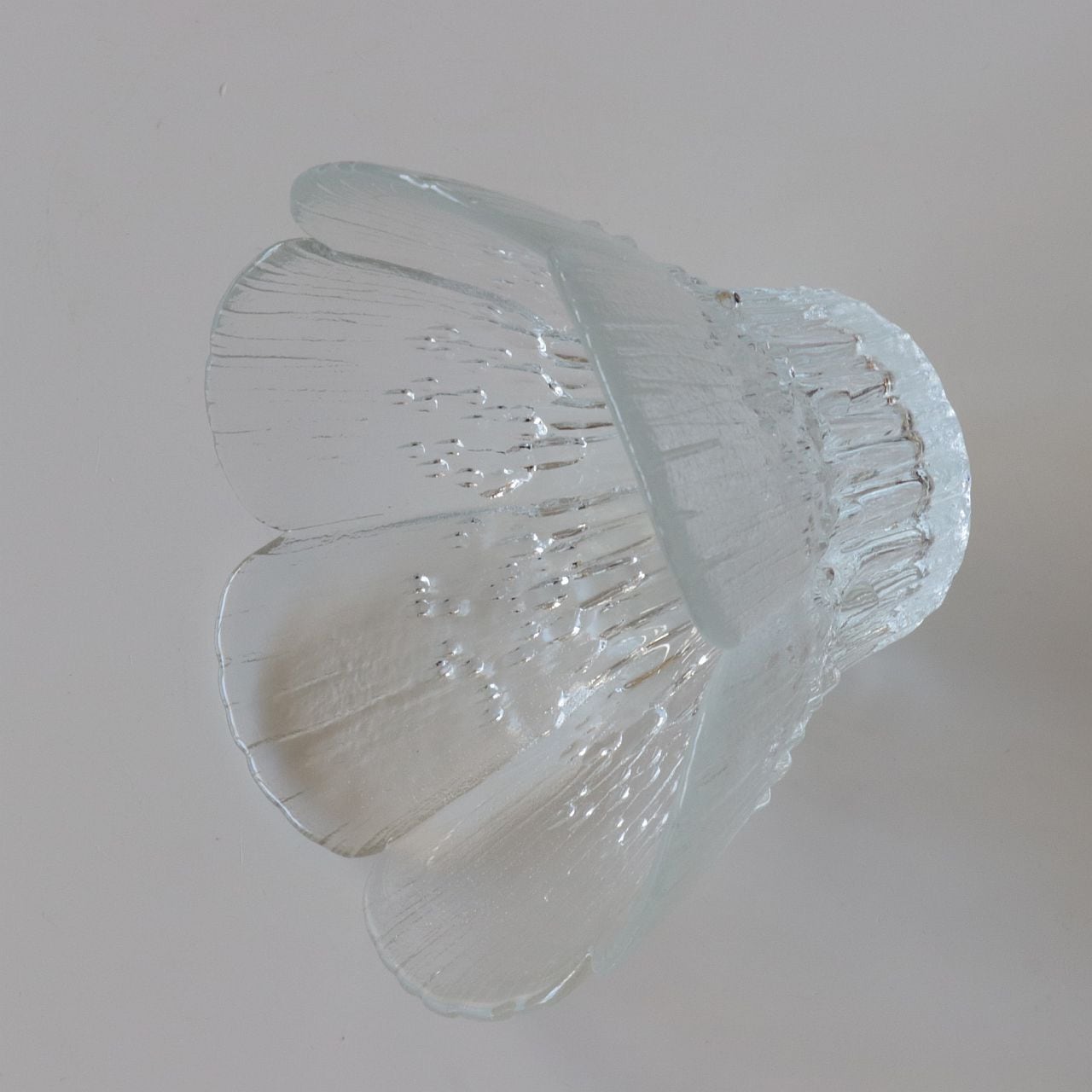 フィンランドのMäntsälän Lasisepatで製作されたキャンドルホルダー。ヘルシンキから北東100㎞ほどにあるMäntsälän(マンツァラ)のガラス工房で製作されたもので フェンネルの花が立体的に表現されたシリーズです。同型でも少しずつサイズや表情が異なり、光を当てると揺らぎの有る表情がそれだけでも美しいアイテムです。