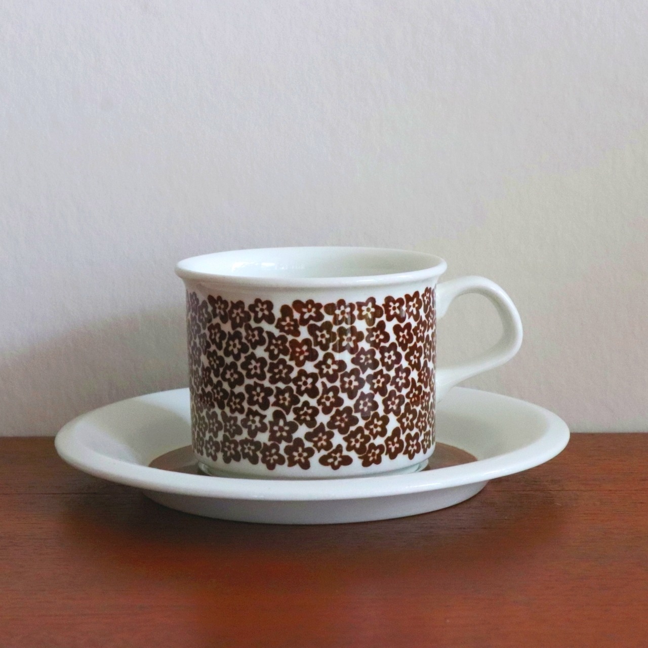 1973年‐1979年の間、フィンランドのARABIAで製作されたファエンツァ(Faenza)。 ぺテル・ウィンクヴィスト(Peter Winquist)がフォルムデザインを、インケリ・セッパラ(Inkeri Seppala)がデコレーションデザインを手がけたシリーズです。 イタリアのファエンツァ国際デザイン賞で金賞を受賞したことから正式名称となったファエンツァ。 茶色の小花模様が有名ですが、他にも青い小花、黄色のライン、黒のラインとシリーズが製作されています。