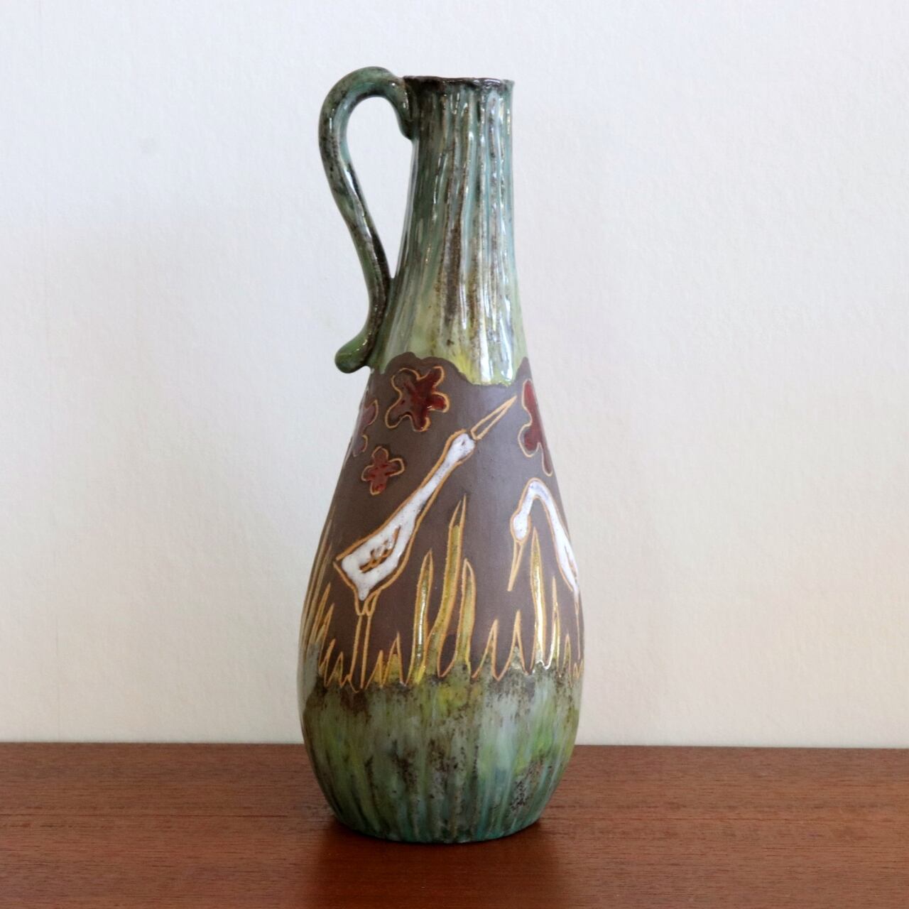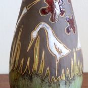 黄色で縁取られた牧歌的で衒いの無い絵柄に、同じく手彩色で描かれた釉薬がはえるフラワーベース。1950年代頃にスウェーデンで製作されたと思われます。